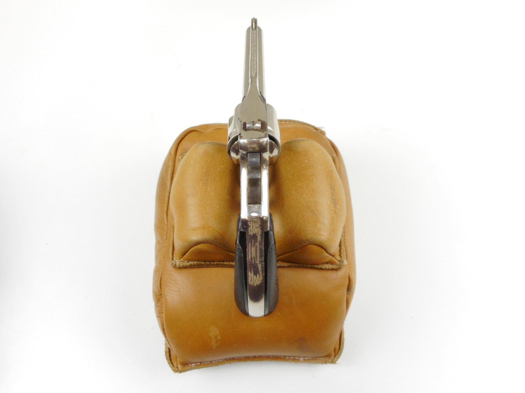 IVER JOHNSON, MODEL: DOUBLE ACTION AUTO EJECT, CALIBER: 32 S&W , ACTION IS TIGHT, HOLDS COCK AND INDEXESS WELL, CHECKERED PLASTIC GRIP PANELS, LIGHT FLAKING OF THE NICKEL FINISH, BLADE FRONT AND NOTCH REAR RAISED SIGHTS, BORE IS FAIR, SHOWS SOME HANDLING MARKS , ACTION: REVOLVER , BARREL LENGTH: 76MM , CONDITION: 5/10 , STOCK # 2464 , SERIAL # 63308 , CLASS: CANADIAN PROHIBITED CLASS