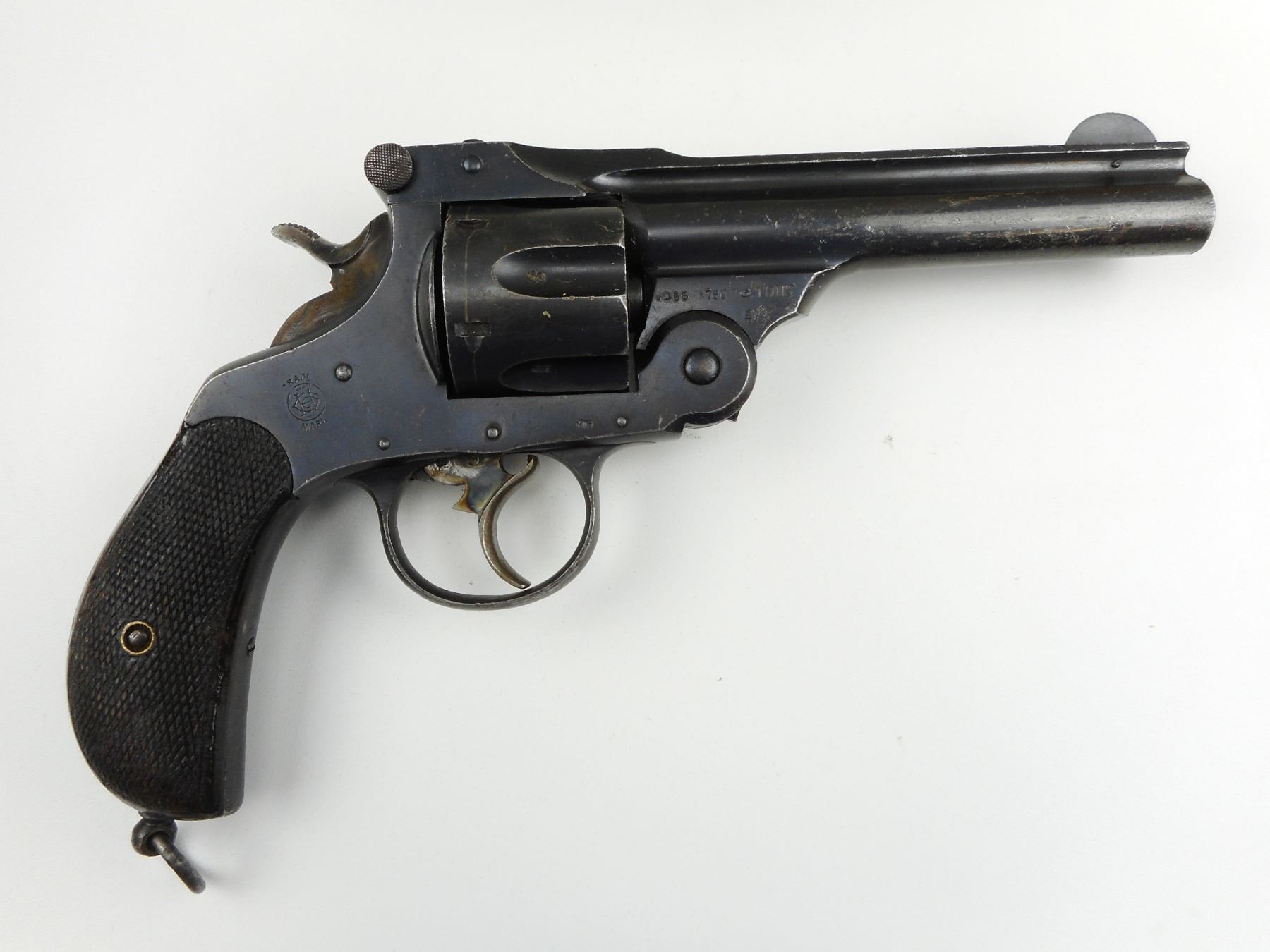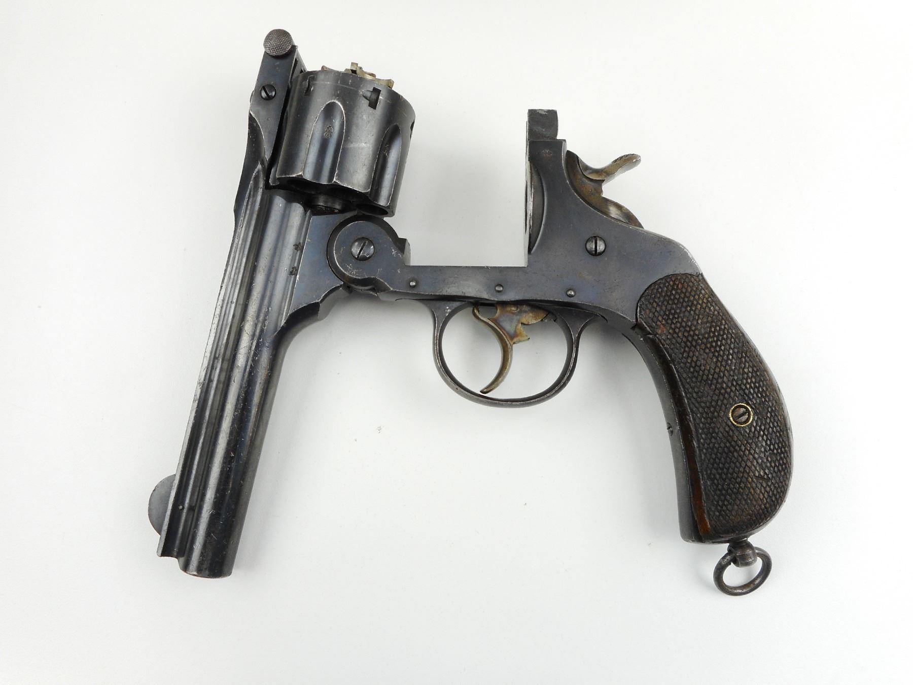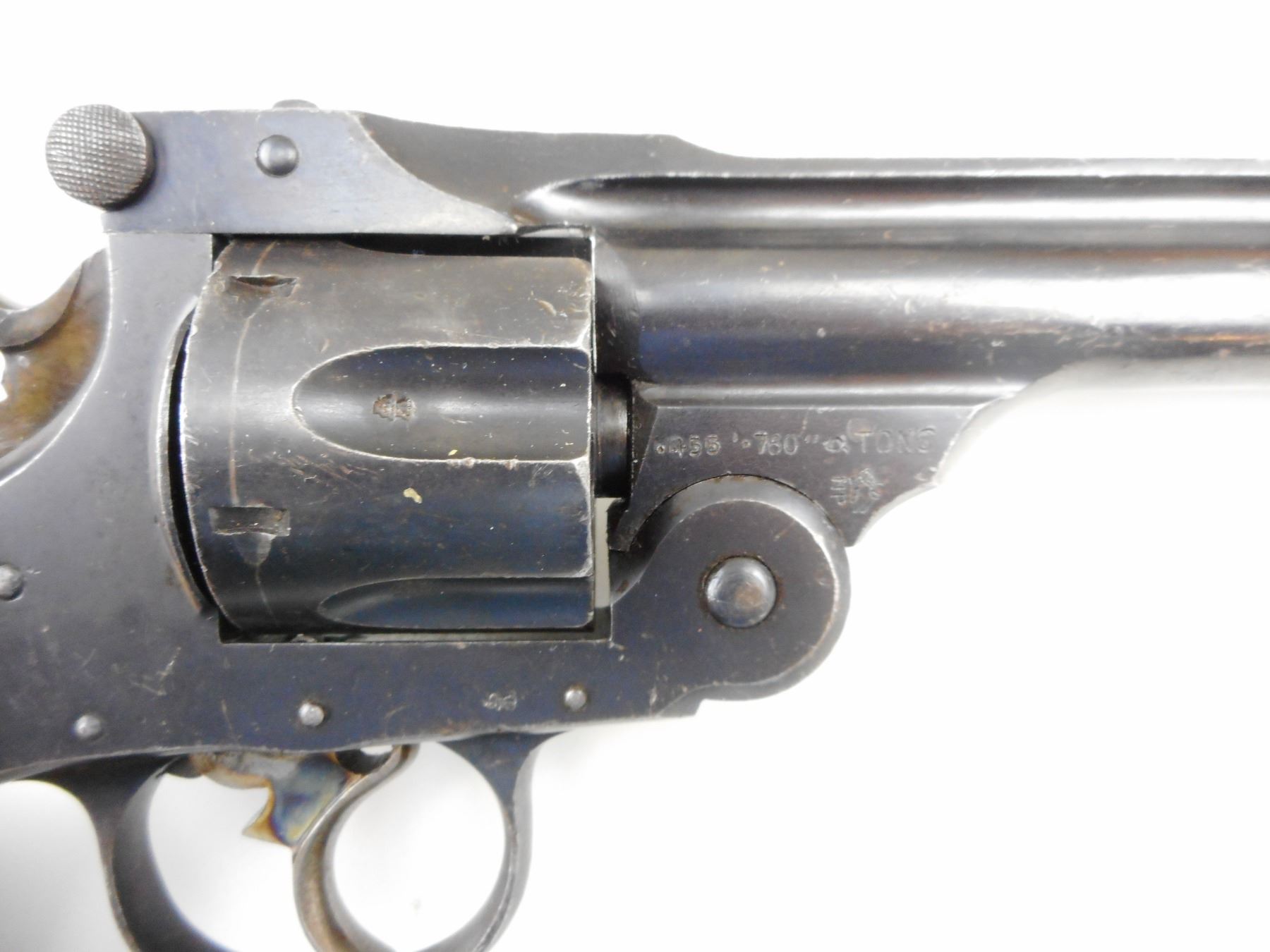 ORBEA, MODEL: OP NO 2 MARK I , CALIBER: 455 REV , BORE IS VERY GOOD, BLADE FRONT AND RAISED NOTCH REAR SIGHT, HOLDS COCK, INDEXES WELL, ACTION IS TIGHT, CHECKERED WOOD GRIP PANELS, LANYAR LOOP, SHOWS SOME HANDLING MARKS, BRITISH PROOFS , ACTION: REVOLVER , BARREL LENGTH: 127MM , CONDITION: 6/10 , STOCK # 3085 , SERIAL # C502 , CLASS: CANADIAN RESTRICTED CLASS