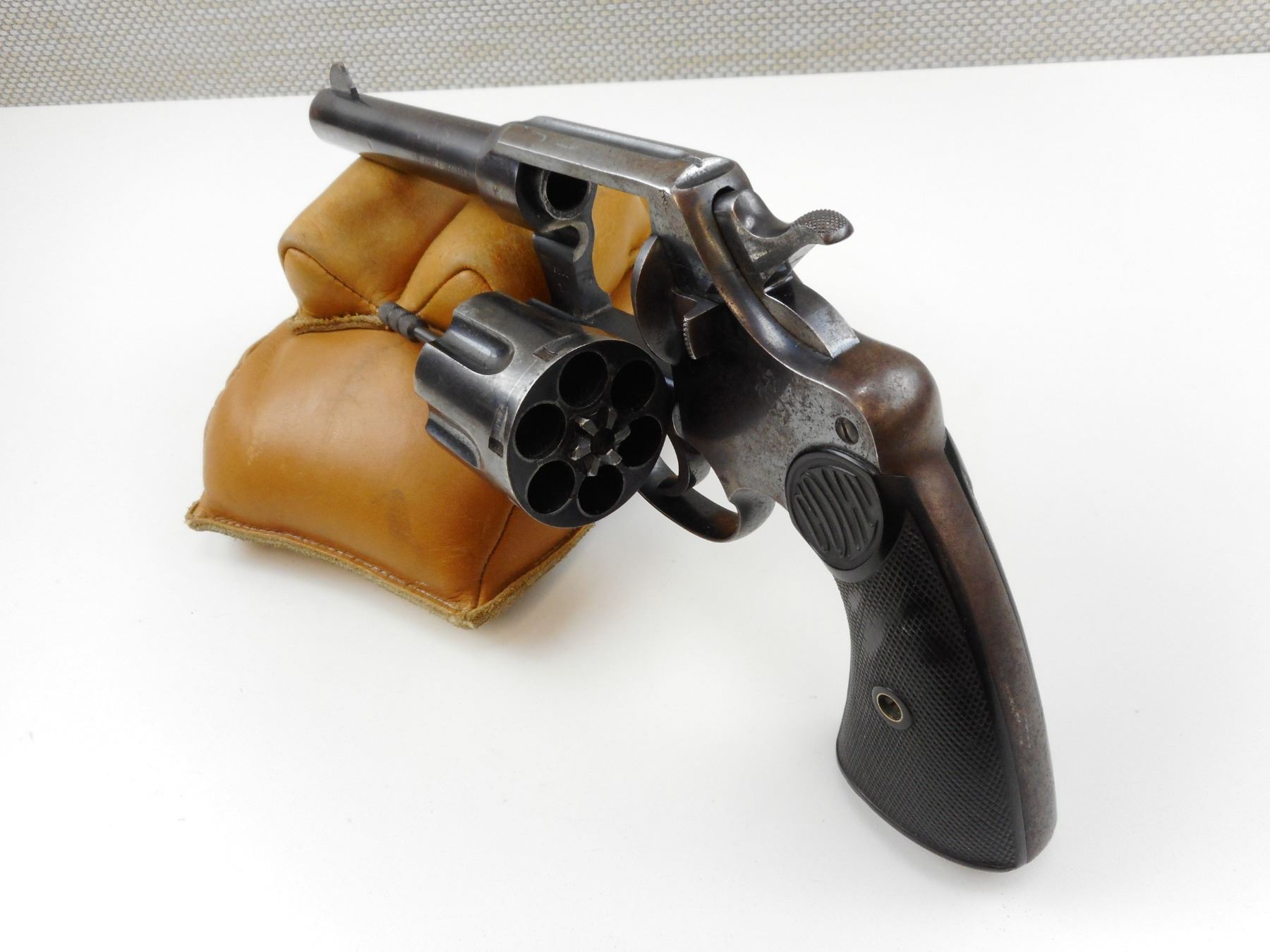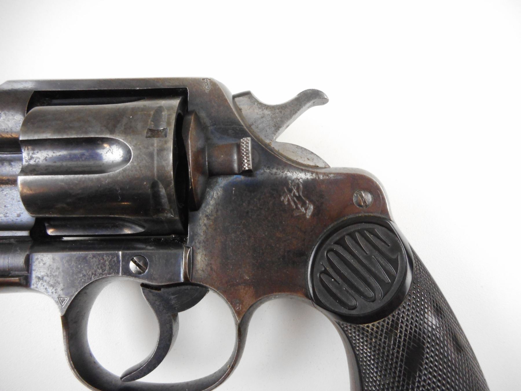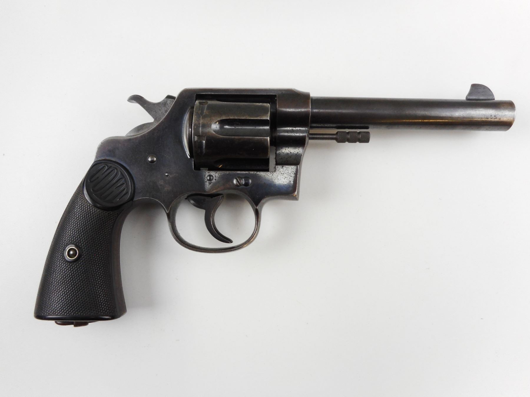 COLT, MODEL: NEW SERVICE, CALIBER: 455 ELEY , BLADE FRONT AND NOTCH REAR SIGHT, VERY GOOD BORE, HOLDS COCK, INDEXES WELL, ACTION IS TIGHT, CHECKERED PLASTIC GRIP PANELS WITH COLT LOGO APPEAR INTACT, SOME LIGHT SURFACE PITTING, LANYARD LOOP , ACTION: REVOLVER , BARREL LENGTH: 140MM , CONDITION: 6/10 , STOCK # 3097 , SERIAL # 105244 , CLASS: CANADIAN RESTRICTED CLASS