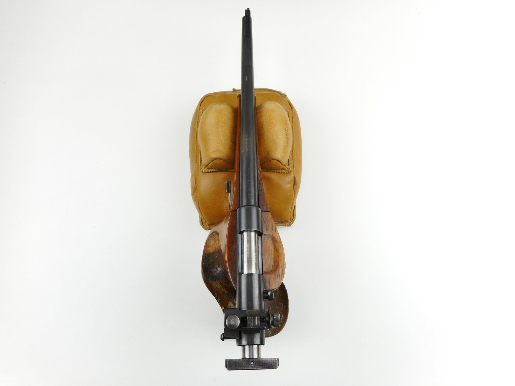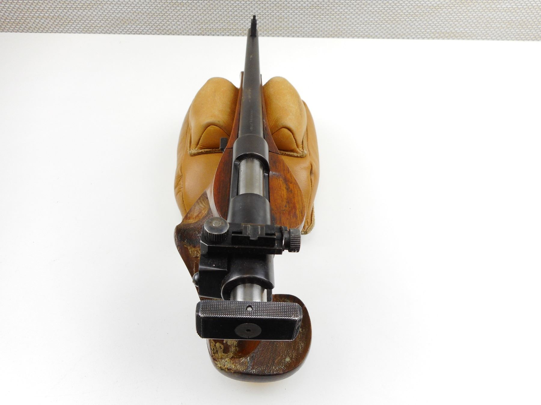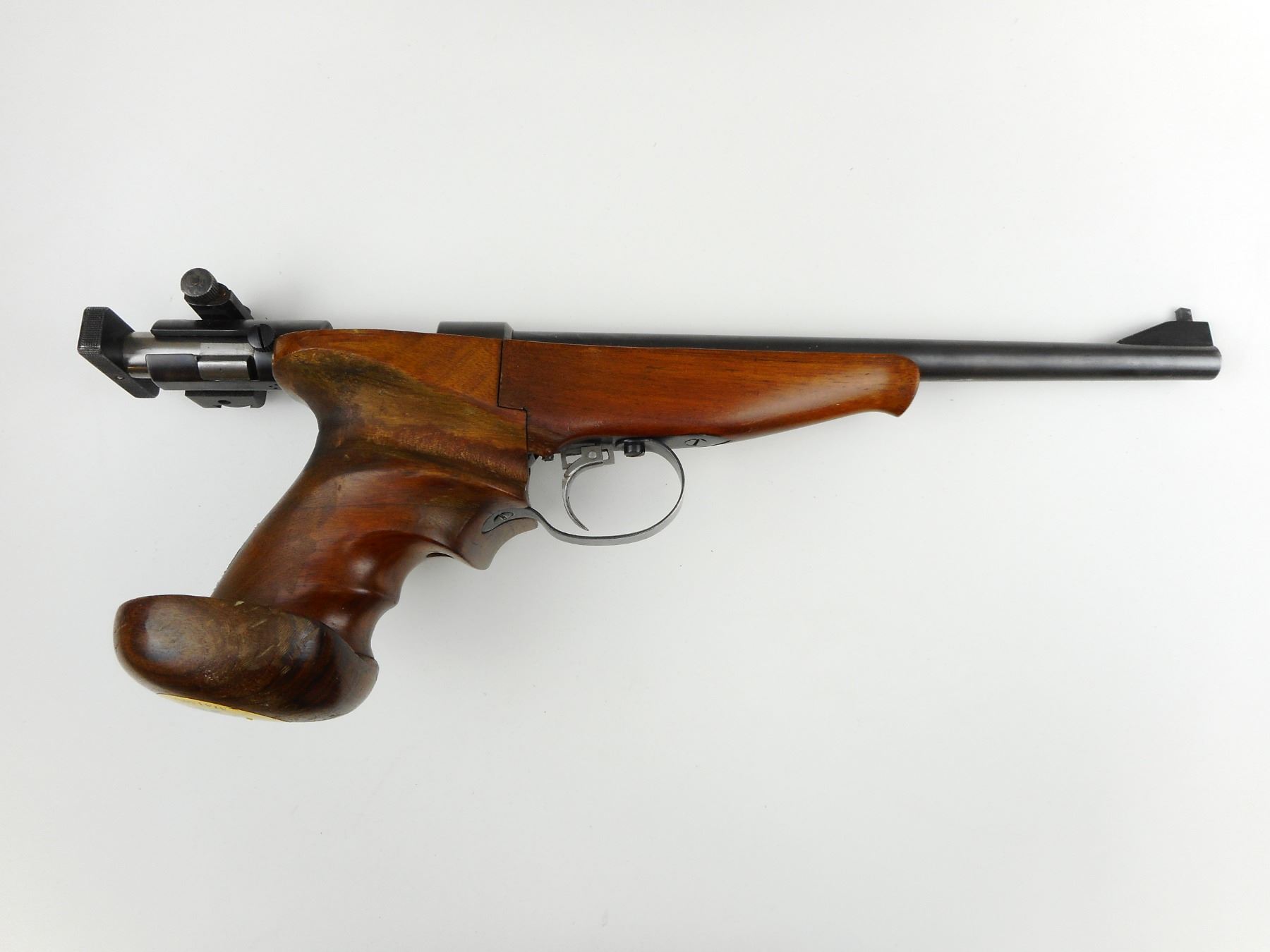 SCHULTZ & LARSEN , MODEL: M51, CALIBER: 22 LR , BORE IS EXCELLENT, RAMP FRONT AND ADJUSTABLE REAR SIGHTS, ERGONOMIC WOOD GRIP PANELS, SHOWS SOME HANDLING MARK , ACTION: SINGLE SHOT HANDGUN , BARREL LENGTH: 280MM , CONDITION: 6/10 , STOCK # 4005 , SERIAL # 81 , CLASS: CANADIAN RESTRICTED CLASS
