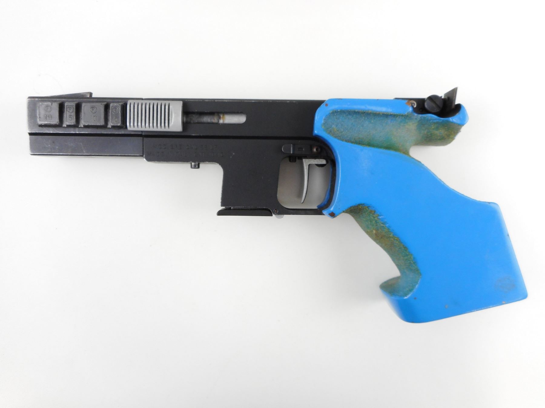 PARDINI , MODEL: SPE, CALIBER: 22 LR , COMES WITH MAGAZINE, EXCELLENT BORE, BLADE FRONT AND ADJUSTABLE REAR SIGHTS, CUSTOM ERGONOMIC WOOD GRIPS THAT ARE PAINTED BLUE, ADJUSTABLE TRIGGER, EXTRA BARREL WEIGHTS ATTACHED, SHOWS SOME HANDLING MARKS , ACTION: SEMI-AUTOMATIC HANDGUN , BARREL LENGTH: 124MM , CONDITION: 7/10 , STOCK # 4019 , SERIAL # 4088 , CLASS: CANADIAN RESTRICTED CLASS