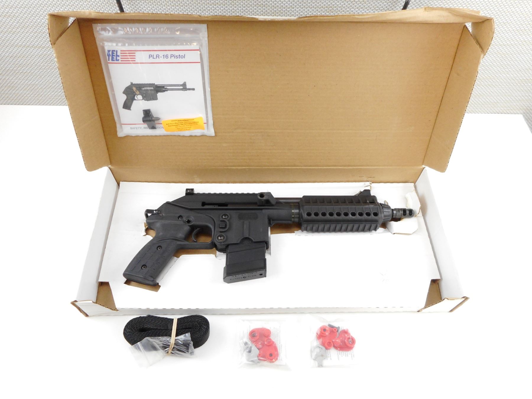 KEL-TEC, MODEL: PLR-16, CALIBER: 223REM , COMES WITH BOX, MAGAZINE, MANUAL AND ACCESSORIES, HAS AN EXCELLENT BORE, MUZZLE BREAK FLASH HIDER, SYNTHETIC FOREND, FULL PISTOL GRIP STOCK, BARLEY CORN FRONT AND PEEP REAR SIGHTS, SHOWS VERY LITTLE HANDLING MARKS , ACTION: SEMI-AUTOMATIC HANDGUN , BARREL LENGTH: 234MM , CONDITION: 8/10 , STOCK # 4026 , SERIAL # P9E56 , CLASS: CANADIAN RESTRICTED CLASS