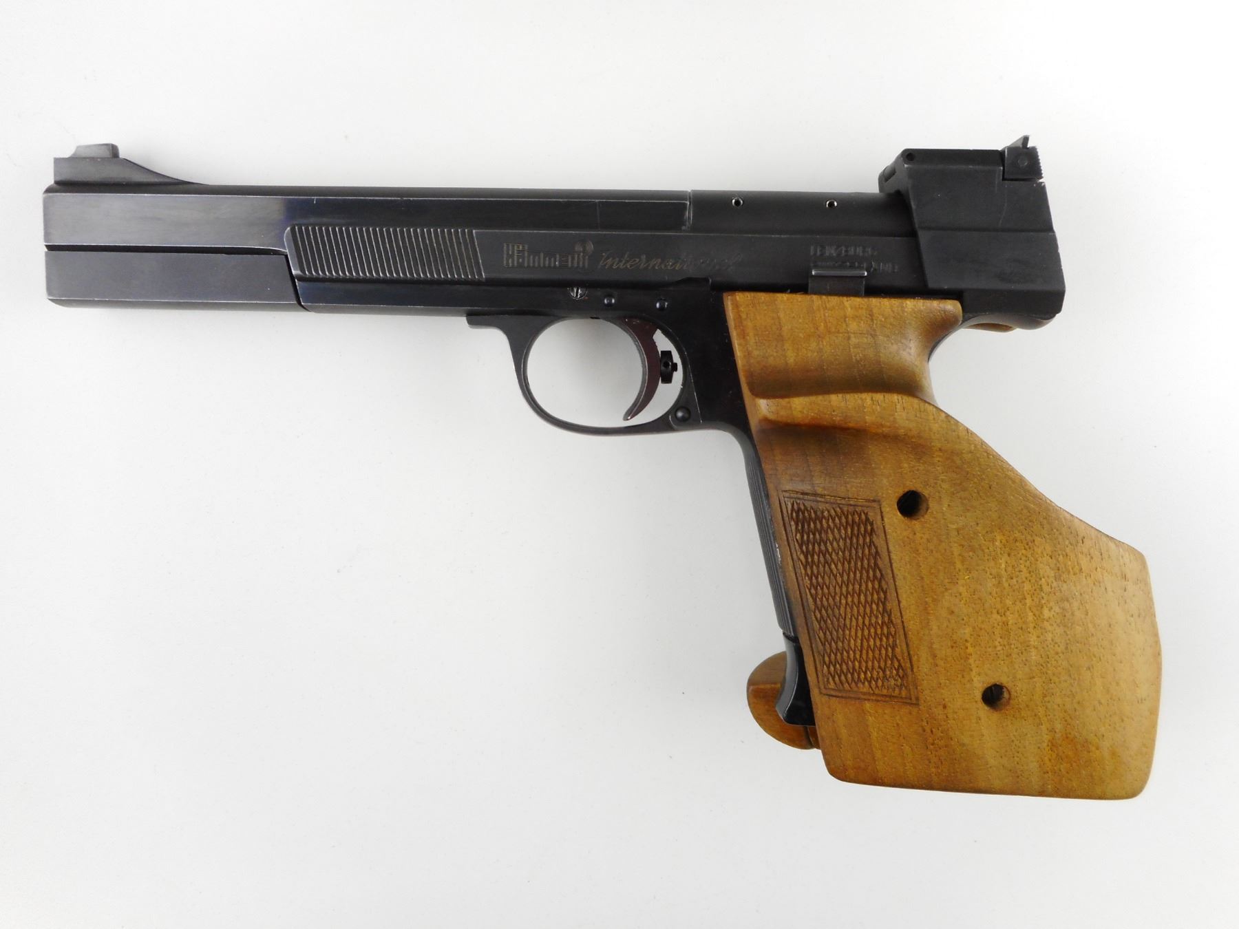 HAMMERLI , MODEL: INTERNATIONAL , CALIBER: 22 LR , COMES WITH MAGAZINE, EXCELLENT BORE, BLADE FRONT AND ADJUSTABLE REAR SIGHT, CHECKERED WOOD ERGONOMIC GRIPS, SHOWS SOME HANDLING MARKS , ACTION: SEMI-AUTOMATIC HANDGUN , BARREL LENGTH: 150MM , CONDITION: 8/10 , STOCK # 4029 , SERIAL # G22495 , CLASS: CANADIAN RESTRICTED CLASS