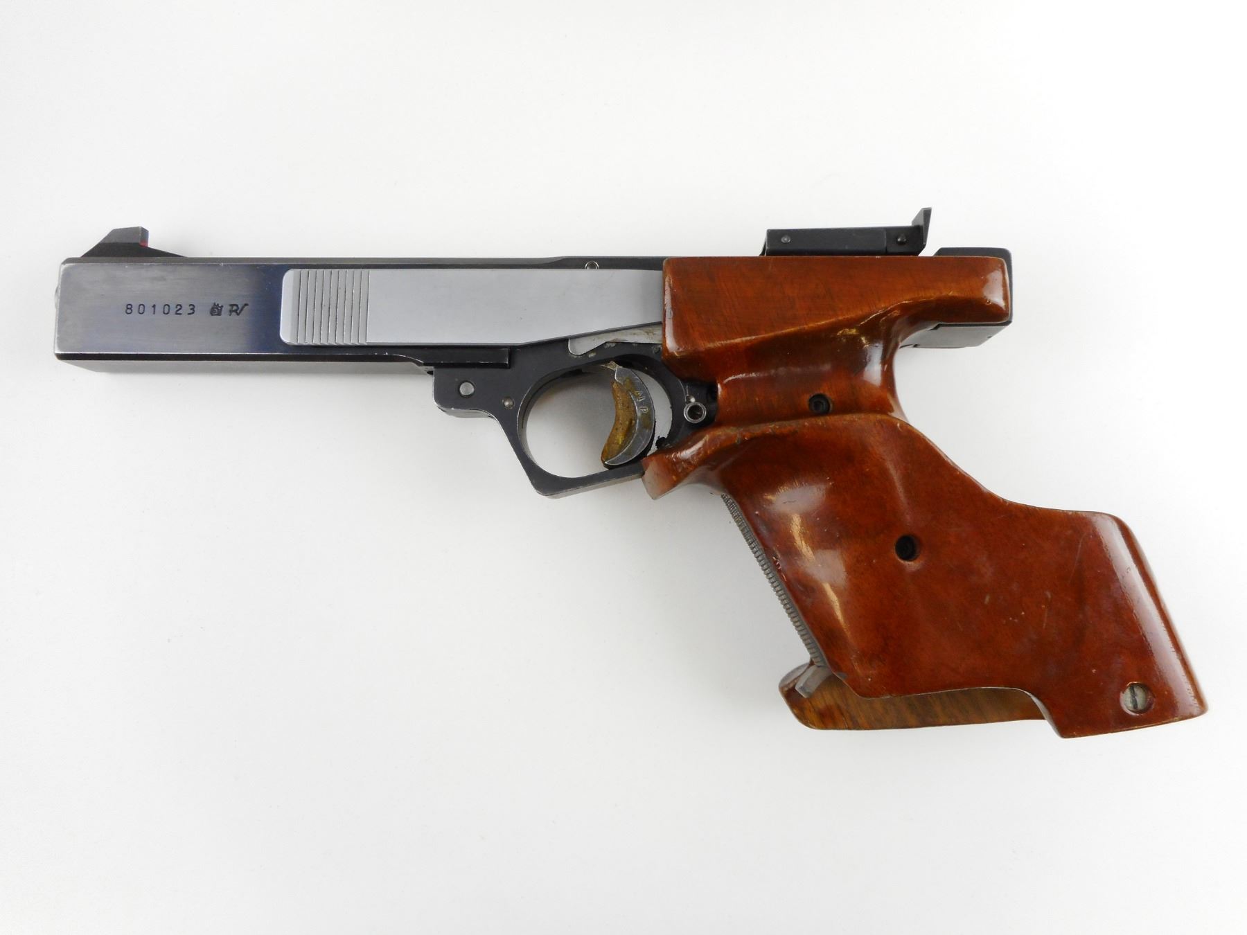 SAKO, MODEL: TRI-ACE, CALIBER: 22 LR , COMES WITH MAGAZINE, BORE IS EXCELLENT, BLADE FRONT AND ADJUSTABLE REAR SIGHTS, ERGONOMIC WOOD GRIPS, GLUE HAS BEEN ADDED TO THE TRIGGER FOR CUSTOMER PREFERENCE, SHOWS SOME HANDLING MARKS , ACTION: SEMI-AUTOMATIC HANDGUN , BARREL LENGTH: 152MM , CONDITION: 6/10 , STOCK # 4032 , SERIAL # 801023 , CLASS: CANADIAN RESTRICTED CLASS