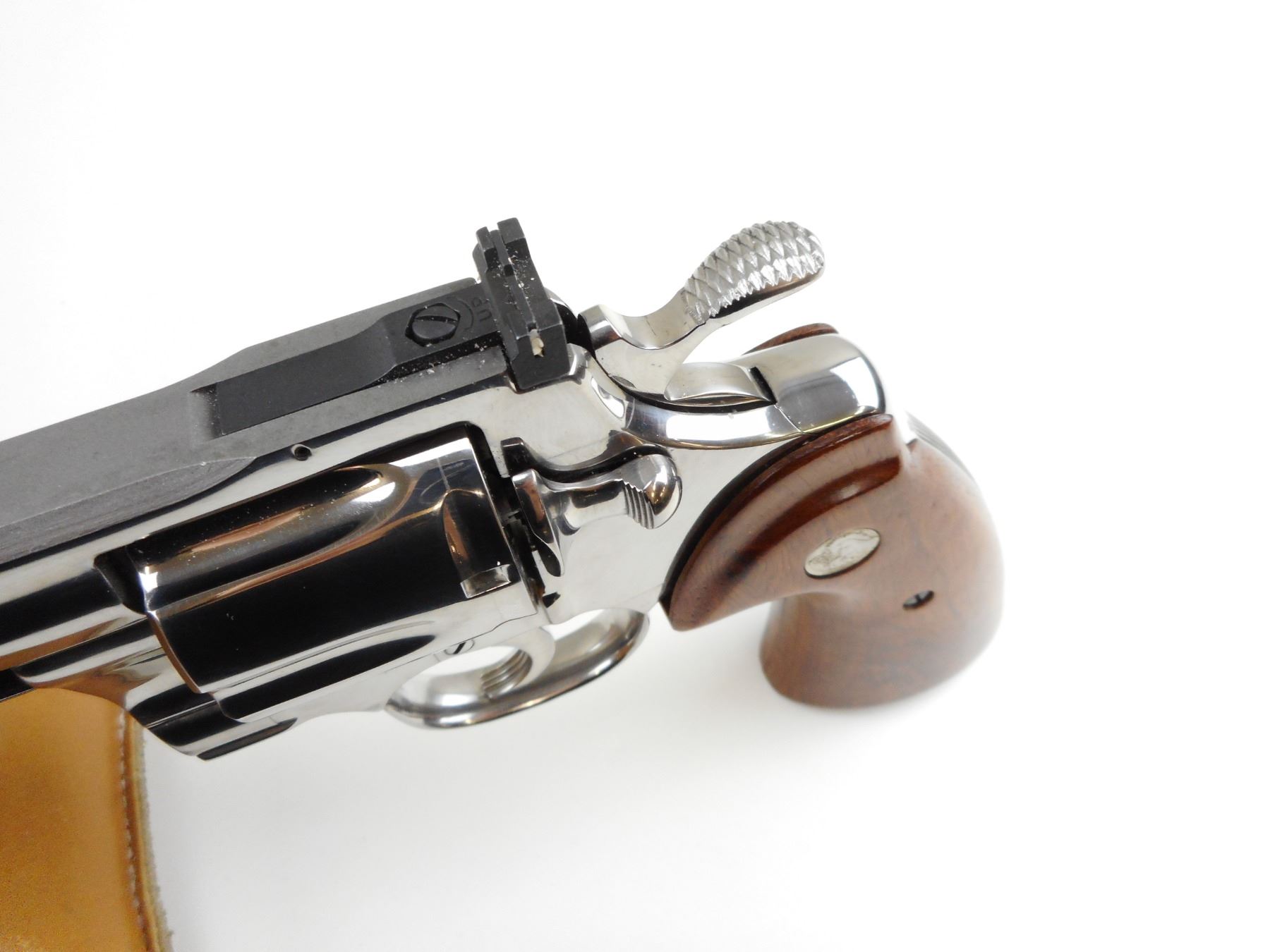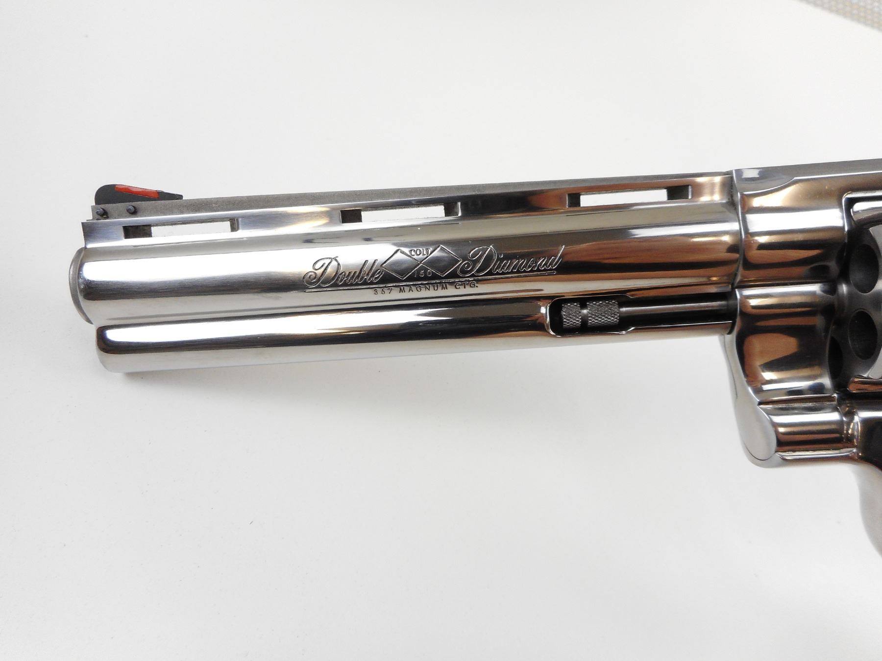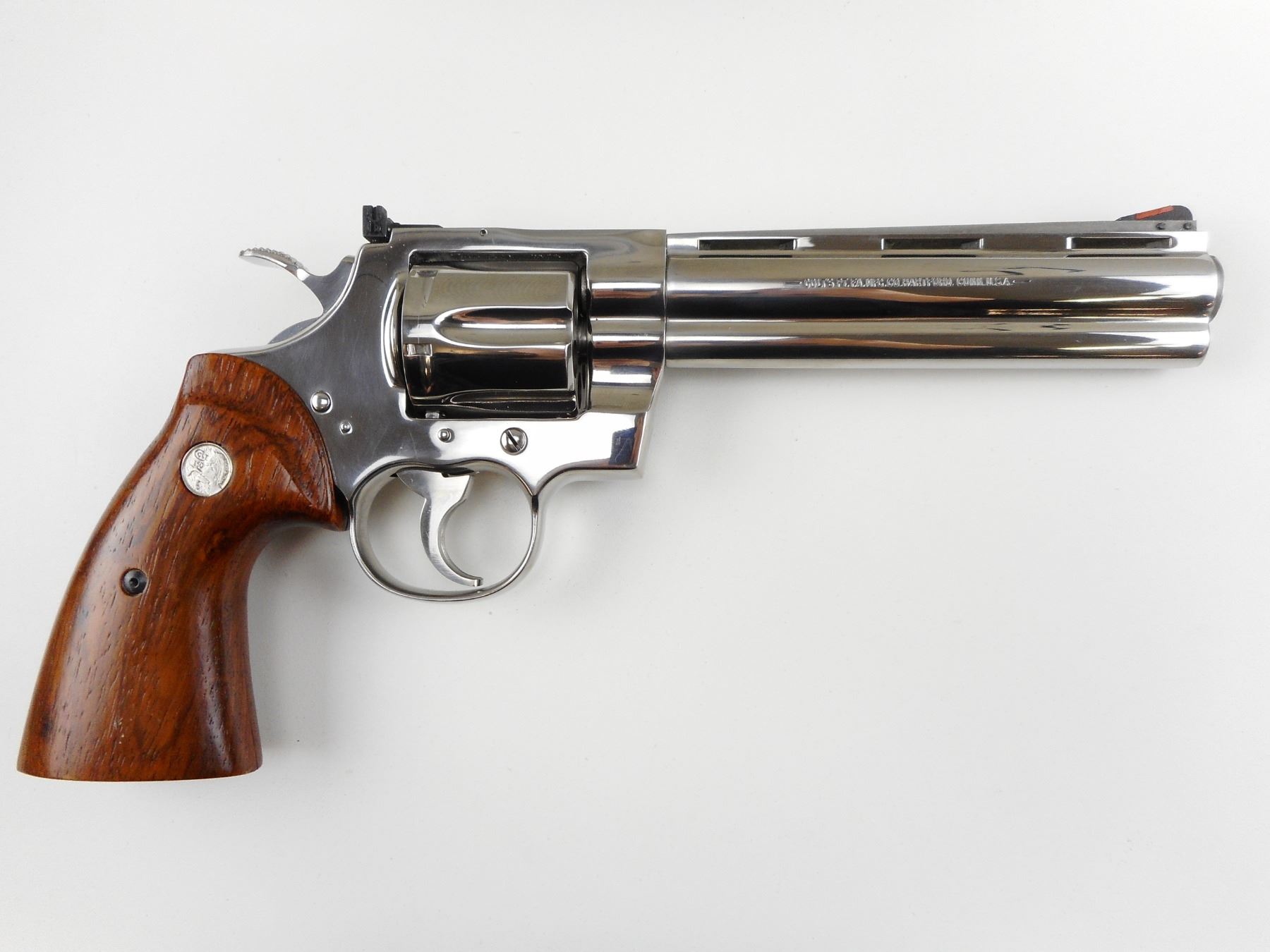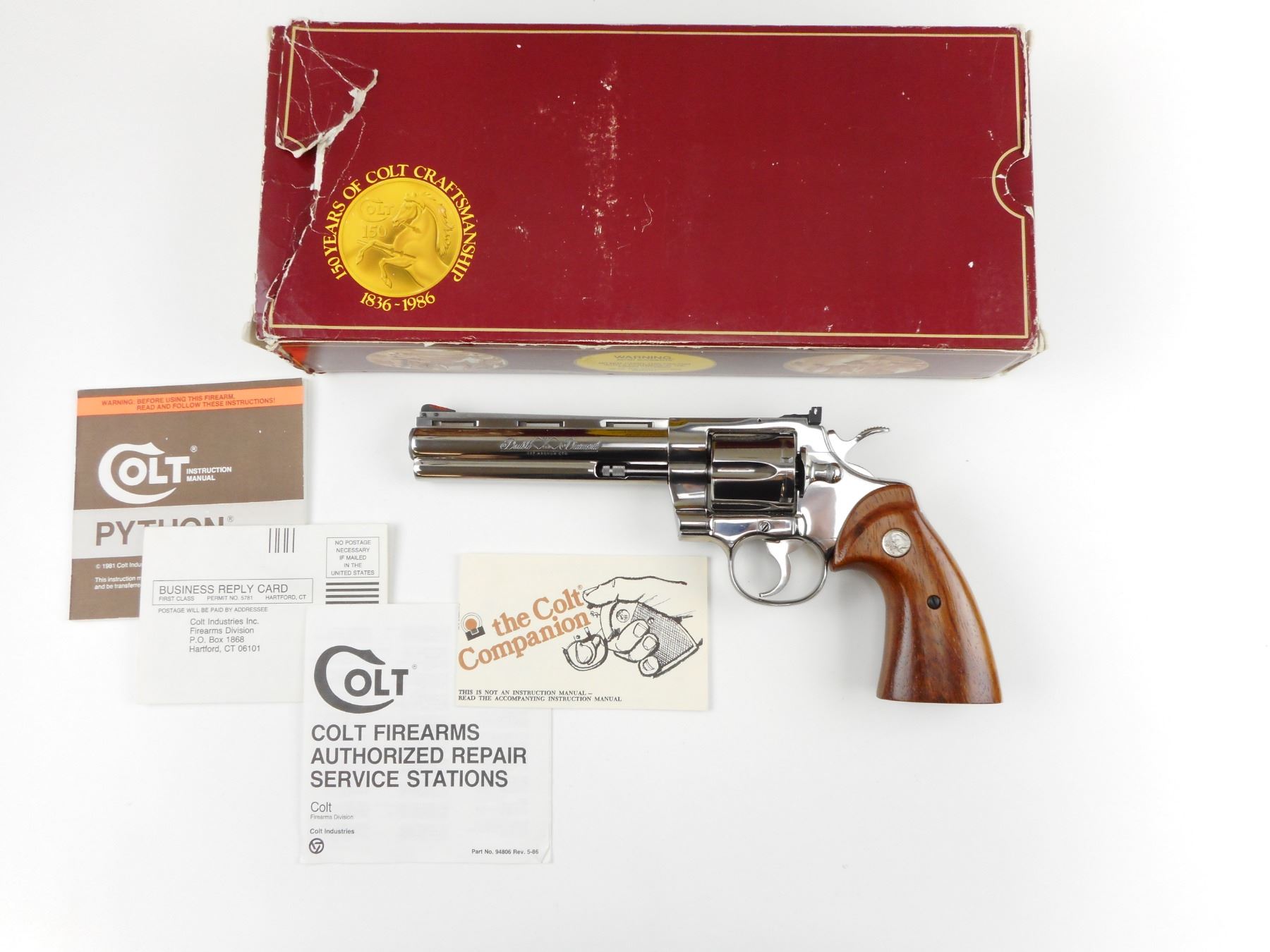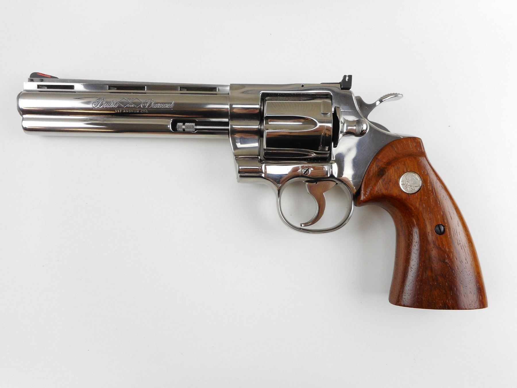 COLT, MODEL: PYTHON DOUBLE DIAMOND , CALIBER: 357 MAGNUM , COMES WITH ORIGINAL BOX, PYTHON DOUBLE DIAMOND COLT 150TH ANNIVERSARY COMMEMORATIVE ,PRESENTED TO US AS UNFIRED, NO 125 OF 1000, POLISHED STAINLESS STEEL, ROSEWOOD GRIPS, VENTED RIB BARREL, FIXED FRONT AND ADJUSTABLE REAR SIGHT, HOLDS COCK, INDEXES WELL, ACTION IS TIGHT, AS NEW , ACTION: REVOLVER , BARREL LENGTH: 152MM , CONDITION: 10/10 , STOCK # 4039 , SERIAL # DD0125 , CLASS: CANADIAN RESTRICTED CLASS