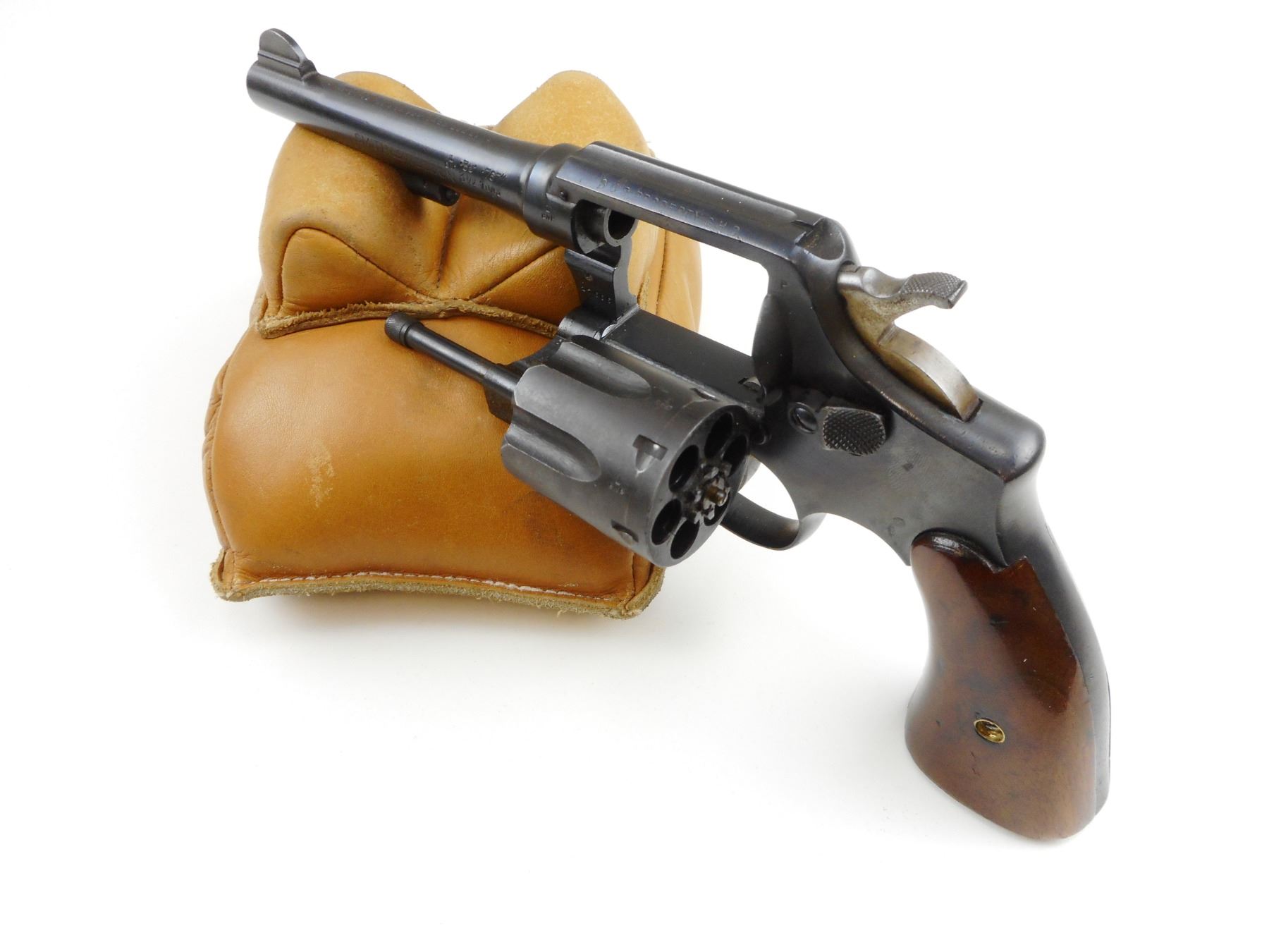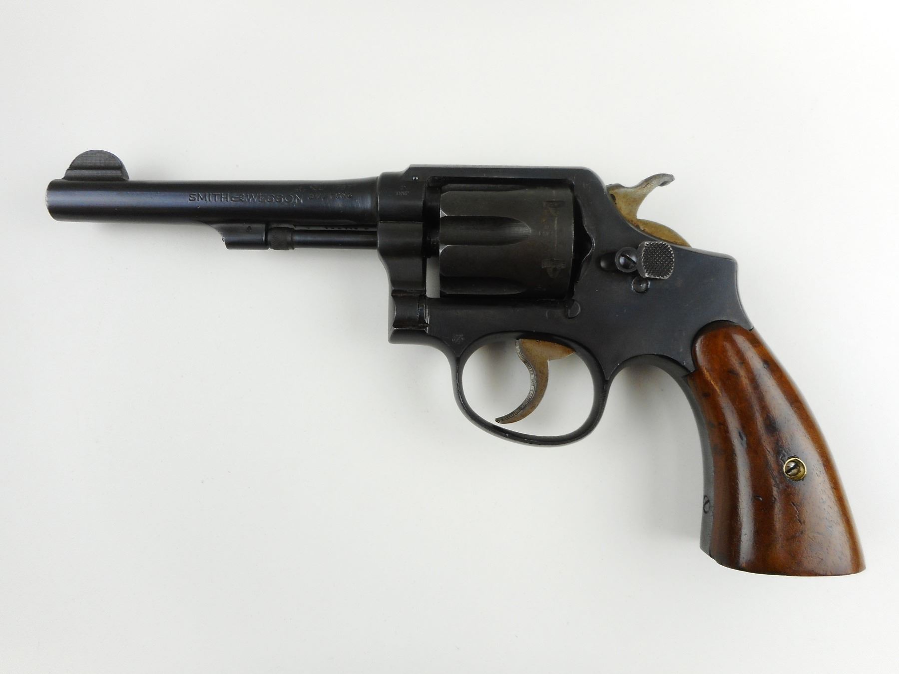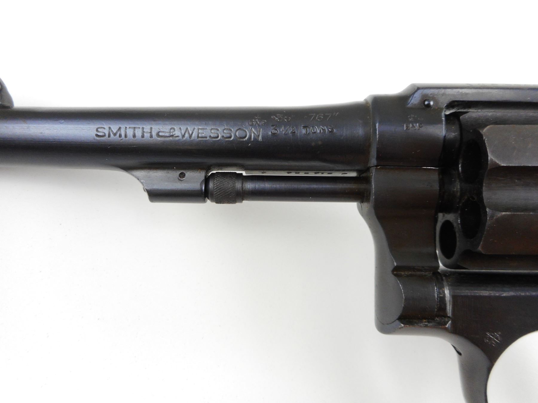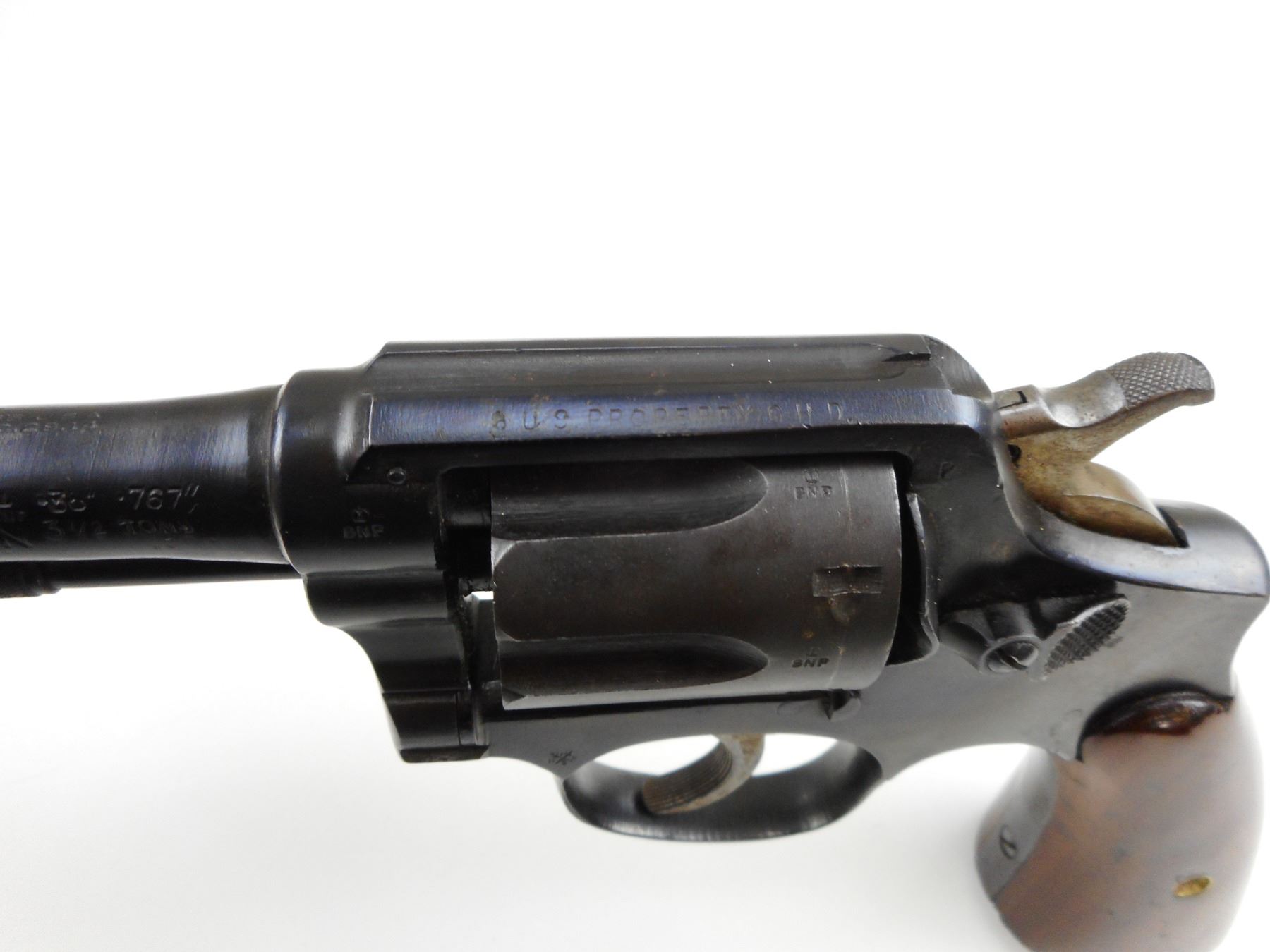 SMITH & WESSON , MODEL: HAND EJECTOR 38 MILITARY & POLICE VICTORY MODEL, CALIBER: 38 S&W , 6 SHOT CAPACITY, BORE IS EXCELLENT, BLADE FRONT AND NOTCH REAR SIGHT, PLAIN WOOD GRIP PANELS, TOP STRAP IS MARKED US PROPERTY GHD, APPEARS TO HAVE BEEN REBLUED, SHOWS SOME HANDLING MARKS, ON THE BUTT IS A V AND SERIAL # 765715, ON THE BASE OF THE WOOD THERE IS MC/S , ACTION: REVOLVER , BARREL LENGTH: 127MM , CONDITION: 7/10 , STOCK # 4042 , SERIAL # 765715 , CLASS: CANADIAN RESTRICTED CLASS