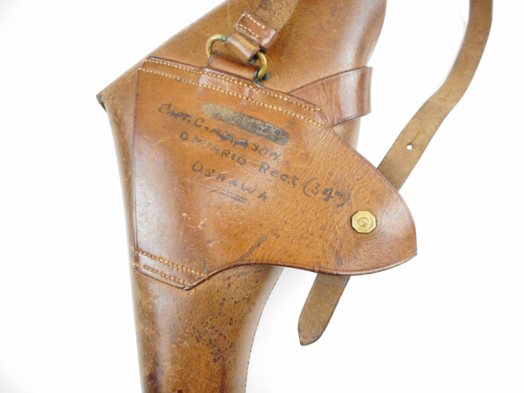 COLT, MODEL: NEW SERVICE, CALIBER: 455 REV , COMES WITH LEATHER HOLSTER THAT HAS WRITING ON THE BACK; CAPT.C.A. MASON ONTARIO. REGT.34. OSHAWA, BLADE FRONT AND GROOVED REAR SIGHT, HOLDS COCK, INDEXES WELL, ACTION IS TIGHT, BORE IS EXCELLENT, CHECKERED PLASTIC GRIP PANELS WITH COLT LOGO RIGHT PANEL HAS A LARGE CHIP, SOME SURFACE PITTING ON THE BARREL, SHOWS SOME HANDLING MARKS , ACTION: REVOLVER , BARREL LENGTH: 141MM , CONDITION: 6/10 , STOCK # 4048 , SERIAL # 100087 , CLASS: CANADIAN RESTRICTED CLASS