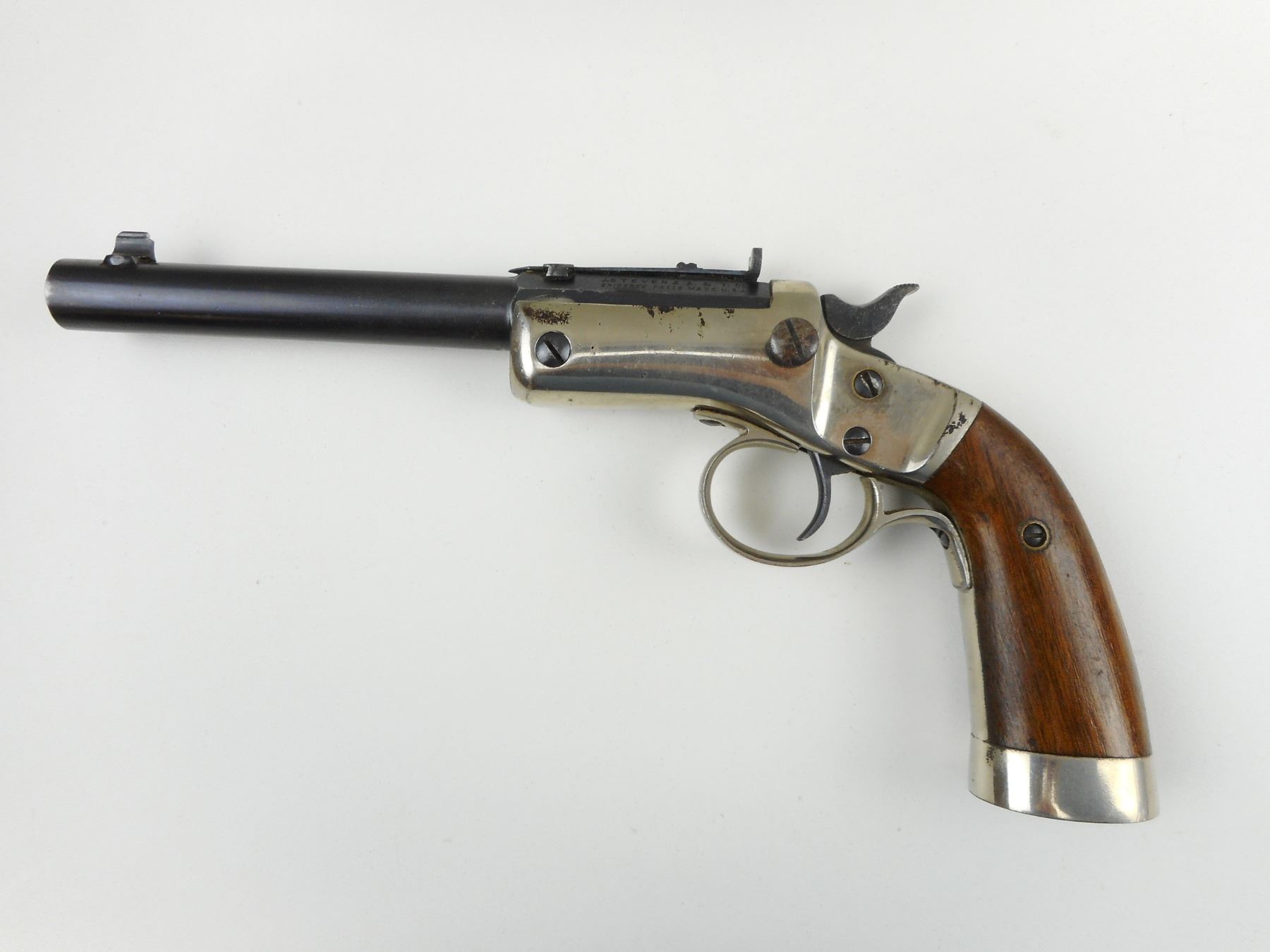 STEVENS, MODEL: NO. 35 OFFHAND TARGET, CALIBER: 22 LR , BORE IS GOOD, BLADE FRONT AND ADJUSTABLE REAR SIGHTS, SHOWS SOME FLAKING OF THE NICKEL FINISH, PLAIN WOOD GRIP PANELS, HOLD COCK, ACTION IS TIGHT, SHOWS SOME HANDLING MARKS , ACTION: SINGLE SHOT HANDGUN , BARREL LENGTH: 152MM , CONDITION: 6/10 , STOCK # 4050 , SERIAL # 27805 , CLASS: CANADIAN RESTRICTED CLASS
