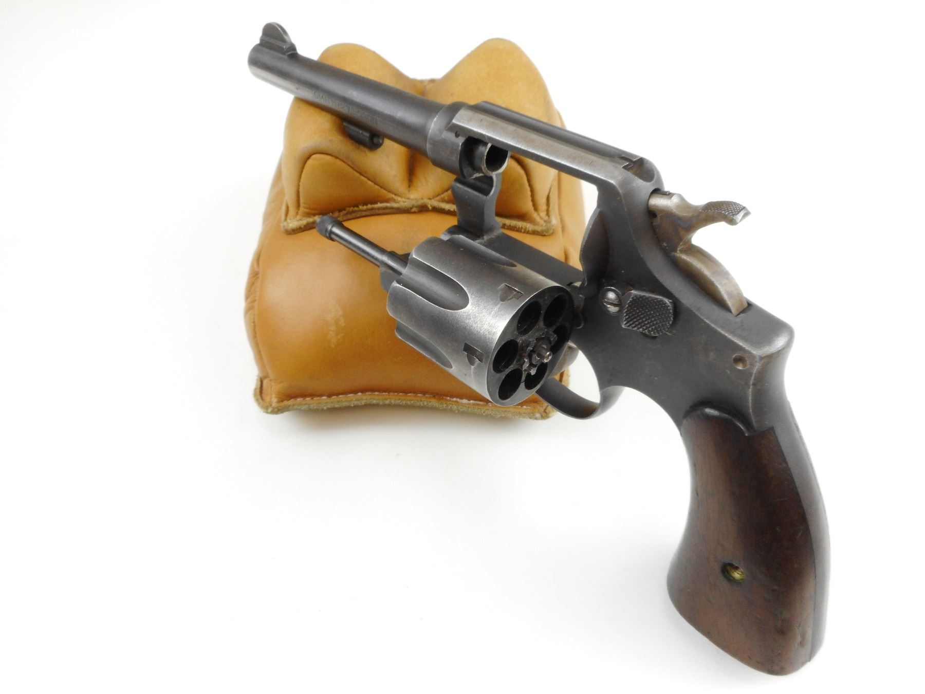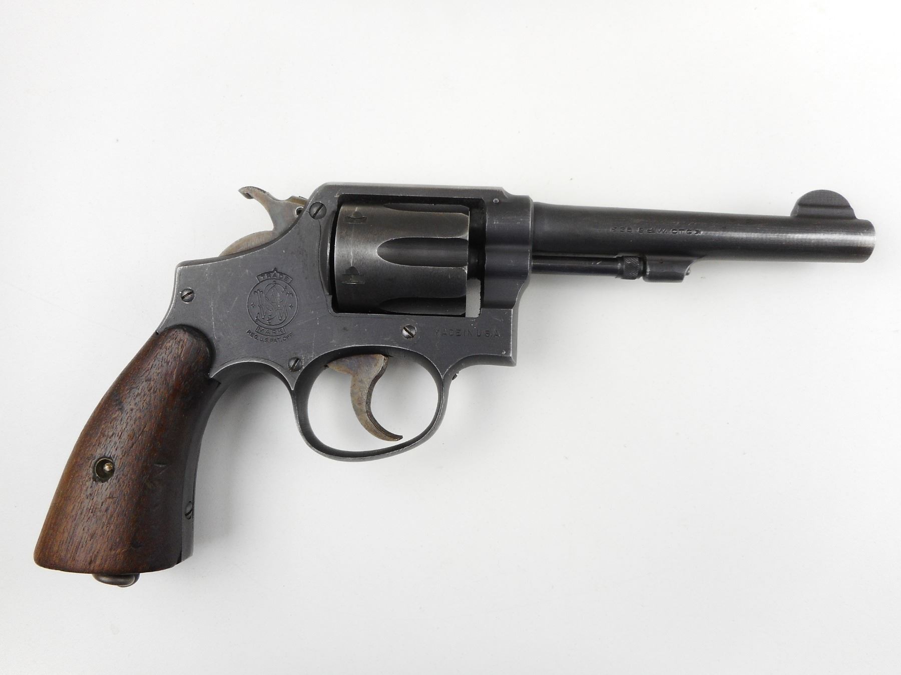 SMITH & WESSON , MODEL: 38 HAND EJECTOR MILITARY & POLICE VICTORY, CALIBER: 38 S&W , BORE IS GOOD, 6 SHOT CAPACITY, BLADE FRONT AND NOTCH REAR SIGHT, PLAIN WOOD GRIP PANELS, LANYARD LOOP, SHOWS SOME HANDLING MARKS , ACTION: REVOLVER , BARREL LENGTH: 127MM , CONDITION: 6/10 , STOCK # 4051 , SERIAL # V155862 , CLASS: CANADIAN RESTRICTED CLASS