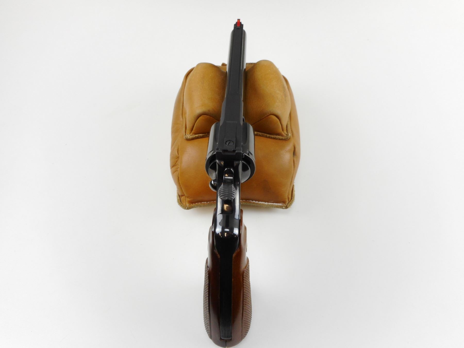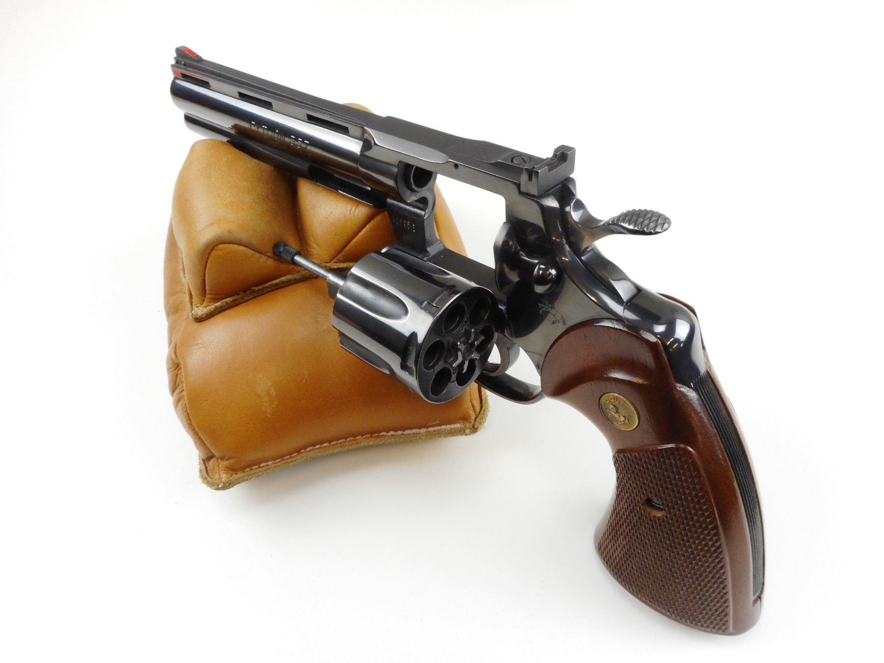 COLT, MODEL: PYTHON , CALIBER: 357 MAG , 6 SHOT CAPACITY, BORE IS EXCELLENT, HOLDS COCK, INDEXES WELL, ACTION IS TIGHT, BLADE FRONT AND ADJUSTABLE REAR SIGHTS ON A VENTED RIB BARREL, FULL BARREL UNDERLUG, CHECKERED WOOD GRIP PANELS WITH COLT LOGO, SHOWS VERY LITTLE HANDLING MARKS , ACTION: REVOLVER , BARREL LENGTH: 152MM , CONDITION: 9/10 , STOCK # 4058 , SERIAL # 93695E , CLASS: CANADIAN RESTRICTED CLASS