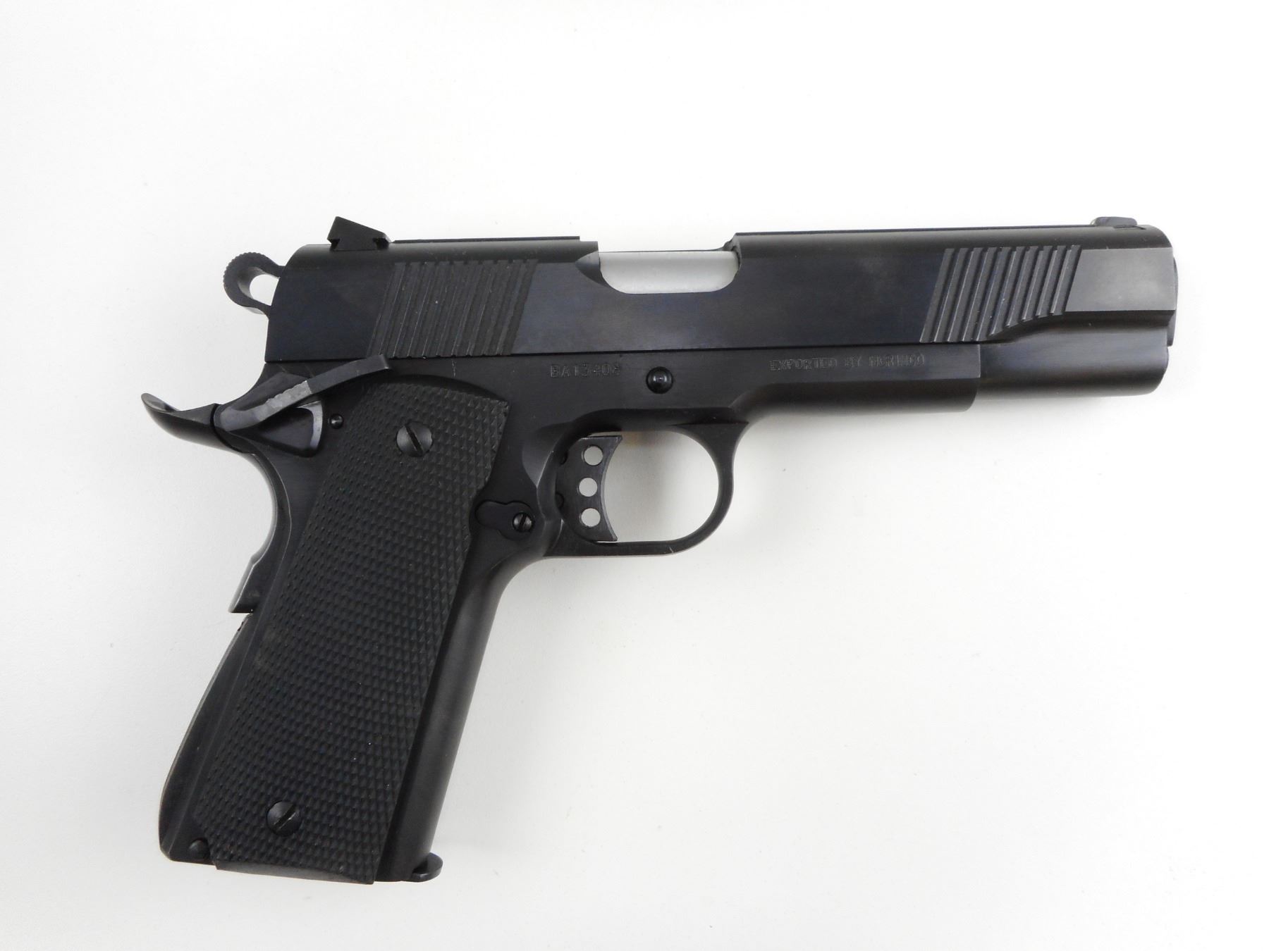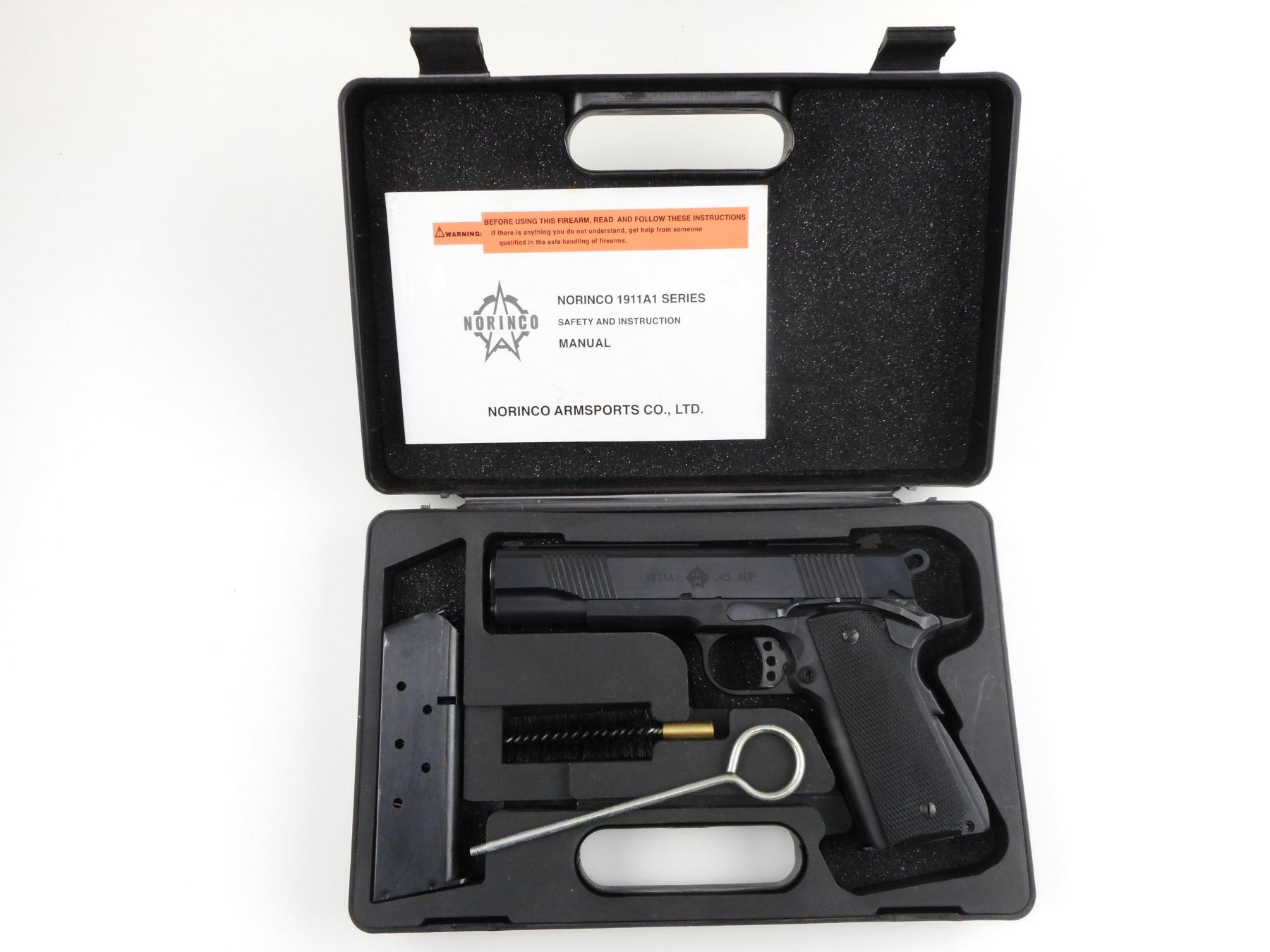 NORINCO, MODEL: 1911A1, CALIBER: 45 ACP , COMES WITH CASE, MANUAL, SECOND MAGAZINE AND CLEANING TOOLS, EXCELLENT BORE, 3 WHITE DOT FRONT SIGHT,FORWARD AND REAR GRIP SERRATIONS, CHECKERED PLASTIC GRIP PANELS, AMBI SLIDE SAFETY, COMBAT HAMMER, SHOWS VERY LITTLE HANDLING MARKS, SKELETONIZED TRIGGER , ACTION: SEMI-AUTOMATIC HANDGUN , BARREL LENGTH: 124MM , CONDITION: 9/10 , STOCK # 4069 , SERIAL # BA13408 , CLASS: CANADIAN RESTRICTED CLASS