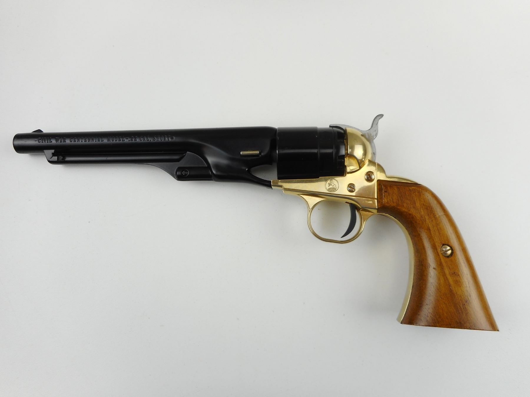 COLT, MODEL: 1860 ARMY CIVIL WAR CENTENNIAL, CALIBER: 22 SHORT , COMES WITH BOX AND DOCUMENT, THIS HAS THE LOOK OF A REVOLVER BUT IS A SINGLE SHOT, BORE IS EXCELLENT, HOLDS COCK, ACTION IS TIGHT, BLADE FRONT AND NOTCH HAMMER REAR SIGHT, PLAIN WOOD GRIP PANELS, BRASS FRAME, MINOR DENT IN LEFT GRIP PANEL, SHOWS VERY LITTLE HANDLING MARKS , ACTION: SINGLE SHOT , BARREL LENGTH: 152MM , CONDITION: 8/10 , STOCK # 4084 , SERIAL # 10680W , CLASS: CANADIAN RESTRICTED CLASS