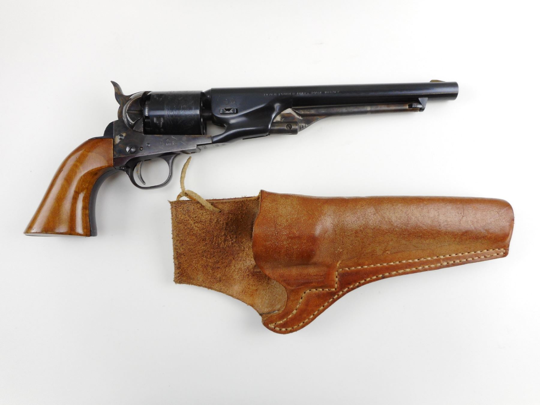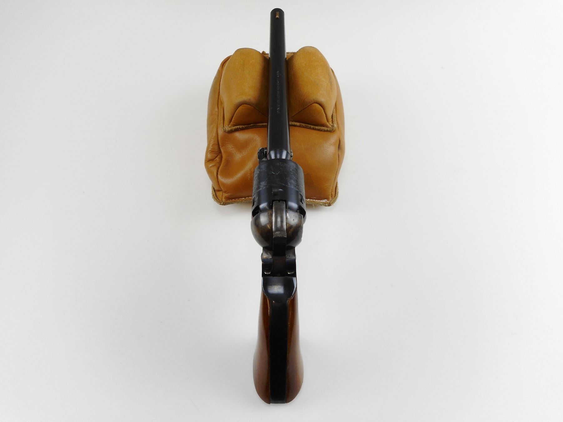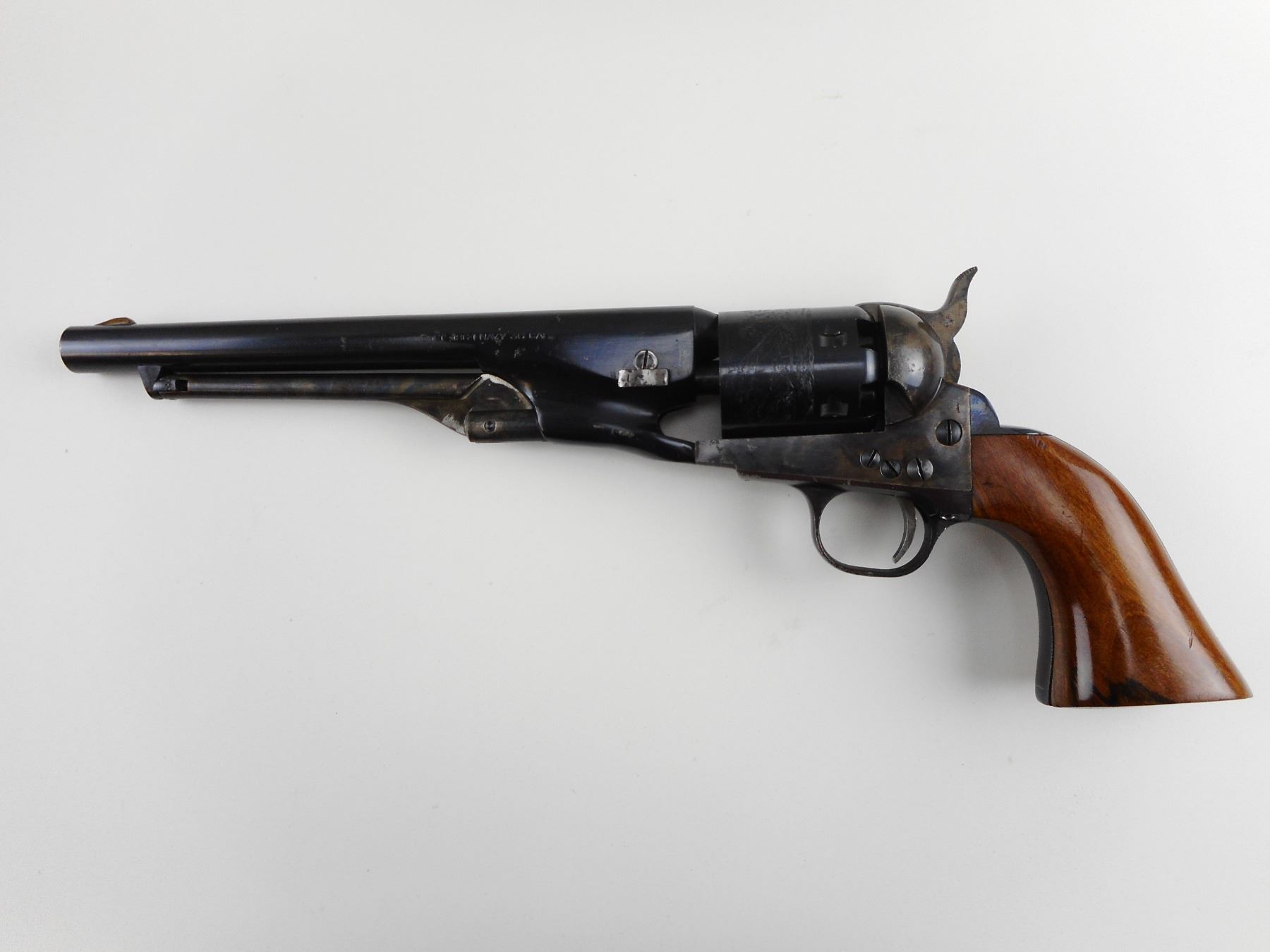 NAVY ARMS , MODEL: 1861 NAVY COLT REPRODUCTION , CALIBER: 36 CAL PERC , COMES WITH LEATHER HOLSTER, 6 SHOT CAPACITY, MANUFACTURED BY PIETTA, BORE IS EXCELLENT , BLADE FRONT AND NOTCH HAMMER REAR SIGHT, HARDWOOD GRIP PANELS, CASE HARDENED RECEIVER FRAME AND STEEL TRIGGER GUARD, SHOWS SOME HANDLING MARKS, HOLDS COCK, INDEXES WELL, ACTION IS TIGHT , ACTION: REVOLVER , BARREL LENGTH: 207MM , CONDITION: 7/10 , STOCK # 4088 , SERIAL # 12486 , CLASS: CANADIAN RESTRICTED CLASS