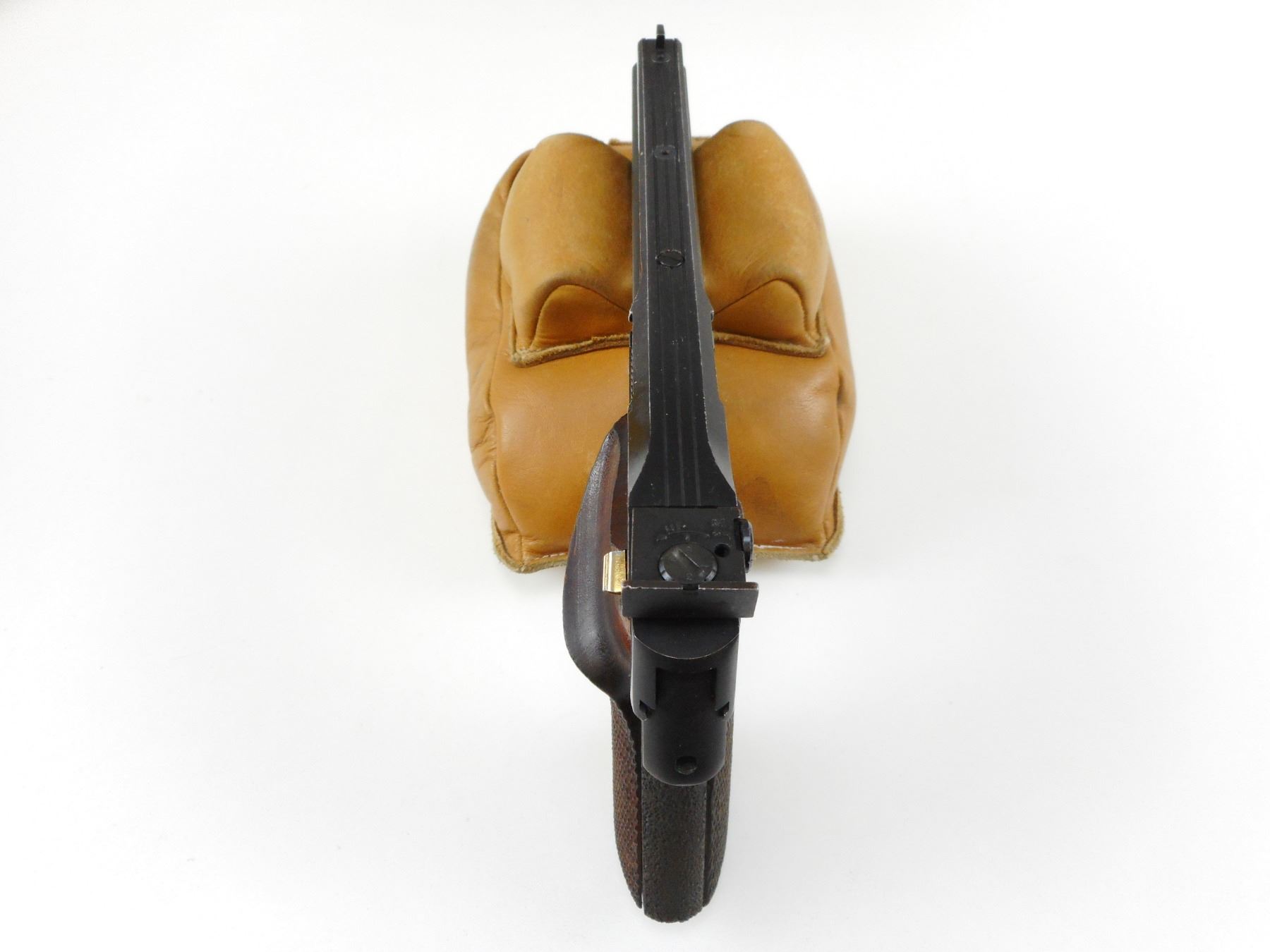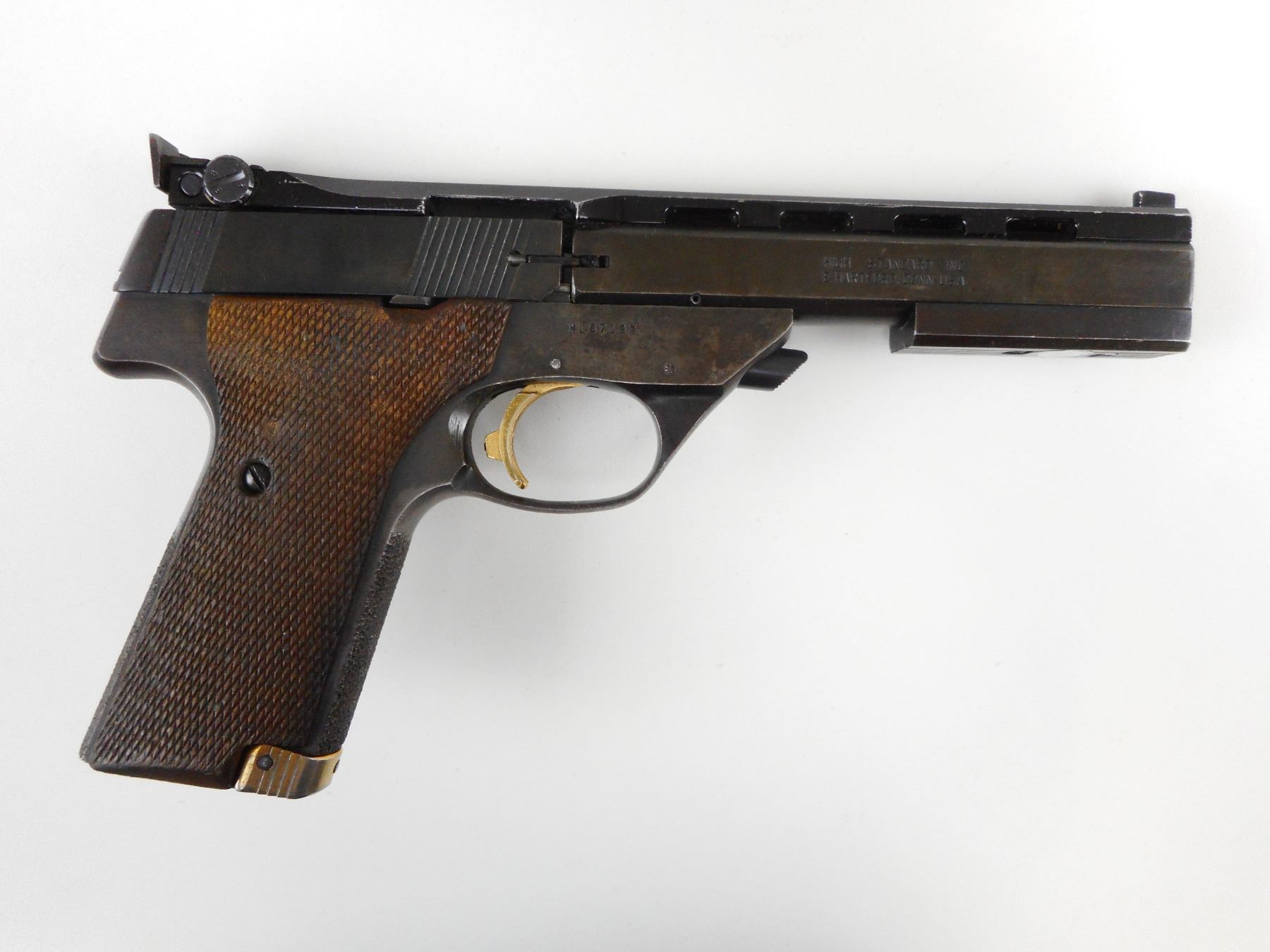 HIGH STANDARD , MODEL: VICTOR, CALIBER: 22 LR , DOES NOT COME WITH MAGAZINE, CONTOURED CHECKERED TARGET GRIPS, RAISED TOP RIB WITH ADJUSTABLE NOTCH AND BLADE SIGHTS, BARREL WEIGHT, GOLD TRIGGER, BORE IS BRIGHT AND WELL WORN , ACTION: SEMI-AUTOMATIC HANDGUN , BARREL LENGTH: 140MM , CONDITION: 5/10 , STOCK # 4094 , SERIAL # ML67192 , CLASS: CANADIAN RESTRICTED CLASS