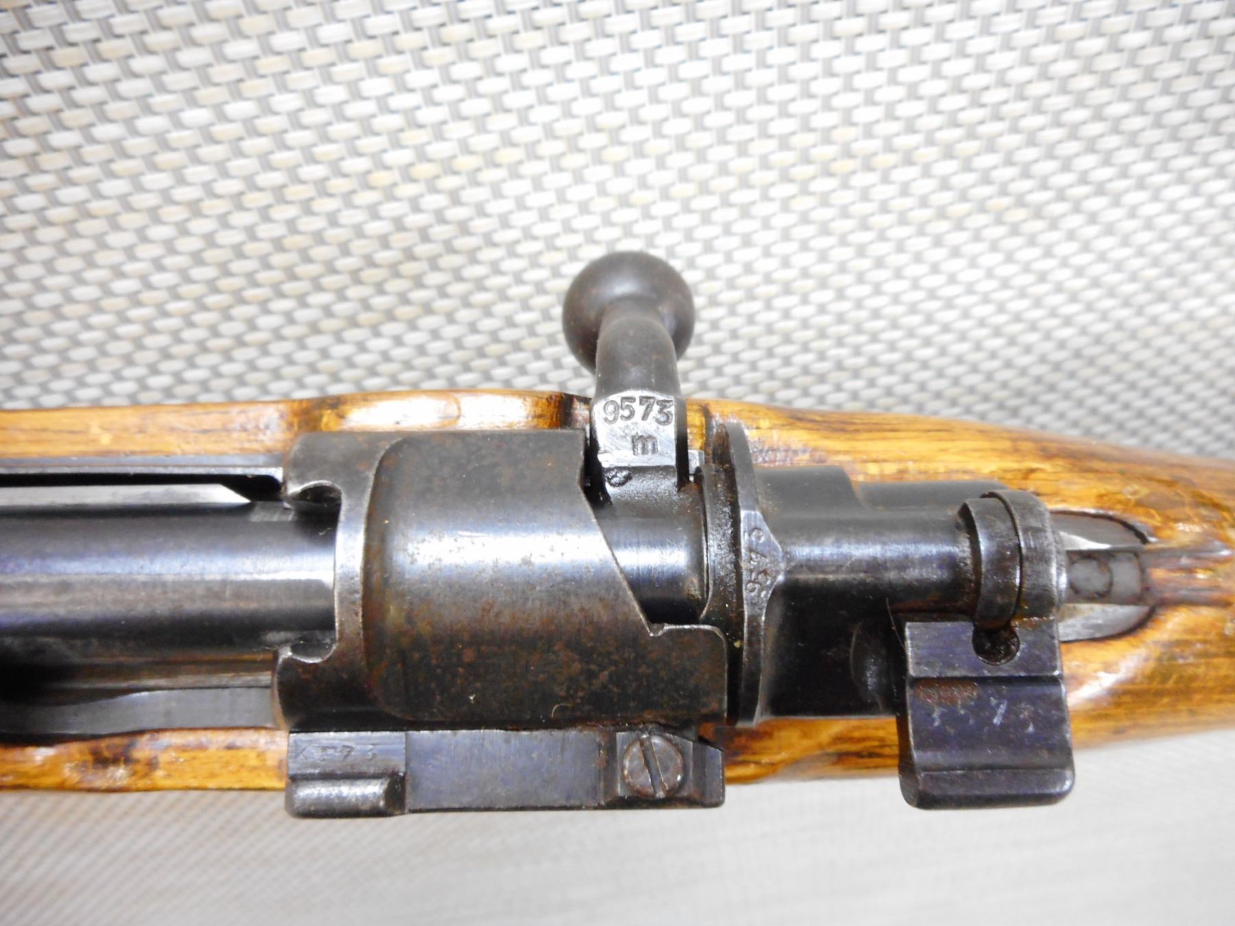 WWII ERA, MAUSER , MODEL: K98 SPORTER , CALIBER: 8MM MAUSER , MAUSER BCD FACTORY, MADE BY GUSTLOFF-WERKE IN 1941, HAS GERMAN PROOF AND MILITARY MARKS, HAS ADJUSTABLE LADDER SIGHT FOR THE REAR, BLADE FRONT SIGHT, METAL BUTT PLATE, REFINISHED WOOD THAT HAS BEEN SPORTERIZED , ACTION: BOLT ACTION RIFLE , BARREL LENGTH: 24" , CONDITION: 4/10 , CLASS: CANADIAN NON RESTRICTED CLASS , STOCK # 9604 , SERIAL # 9573