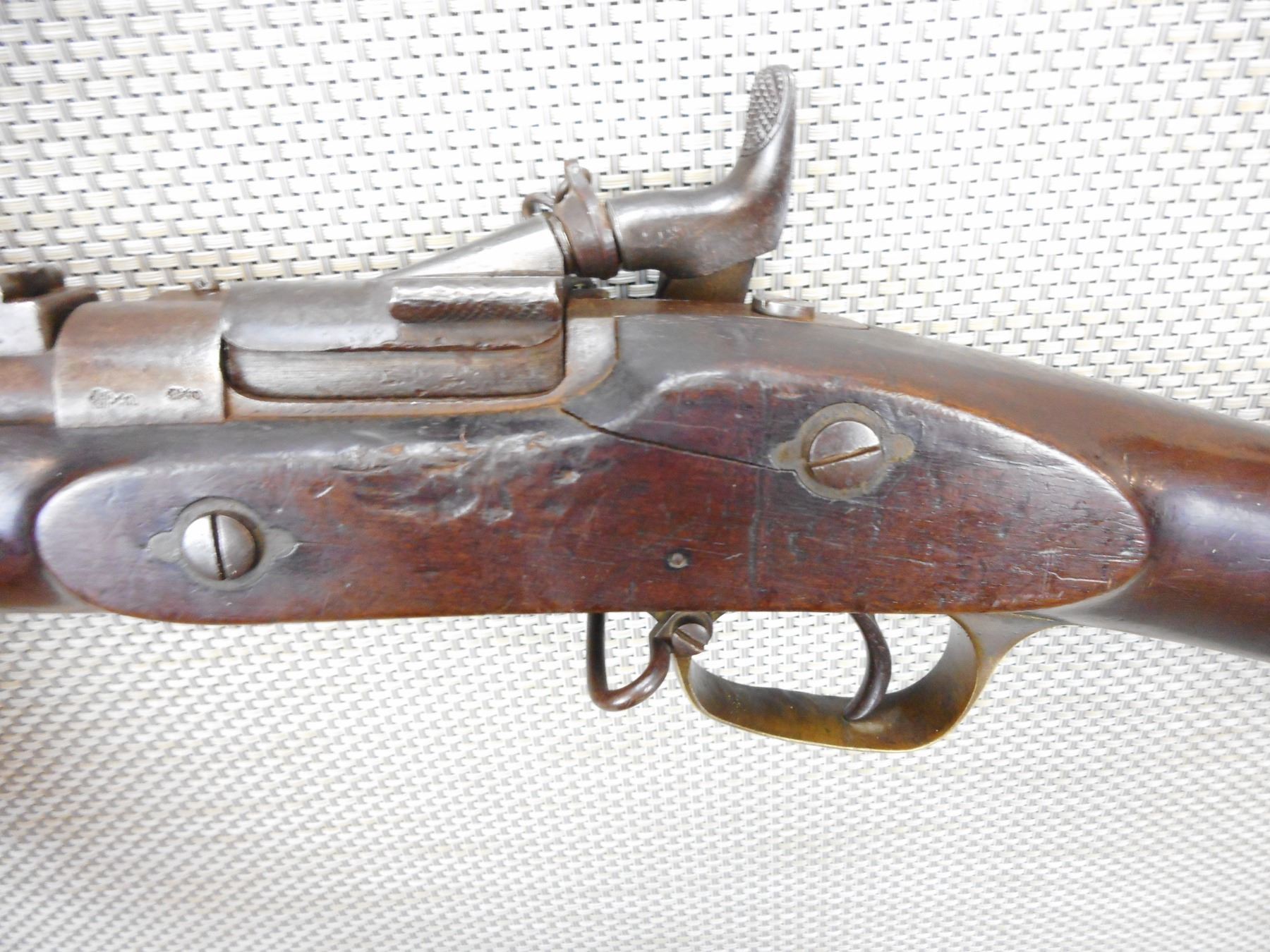 SNIDER ENFIELD , MODEL: SPORTER , CALIBER: 577 SNIDER , MANUFACTURED BY LA CO., DC MARKED ON THE STOCK, DATED 1863, FOLDING REAR SIGHT, BRASS FRONT BLADE SIGHT, BORE IS PITTED WITH THE LAST 4-5 INCHES OF RIFLING REMOVED, CRACK STOCKED WITH HOLE DRILLED IN THE STOCK, BROKEN FIRING PIN, HAS A BRASS TRIGGER GUARD AND BUTT PLATE HAS A NIPPLE PROTECTOR AND CHAIN , ACTION: BREECH BLOCK , BARREL LENGTH: 24 1/4" , CONDITION: 3/10 PARTS , CLASS: CANADIAN ANTIQUE CLASS , STOCK # , SERIAL #