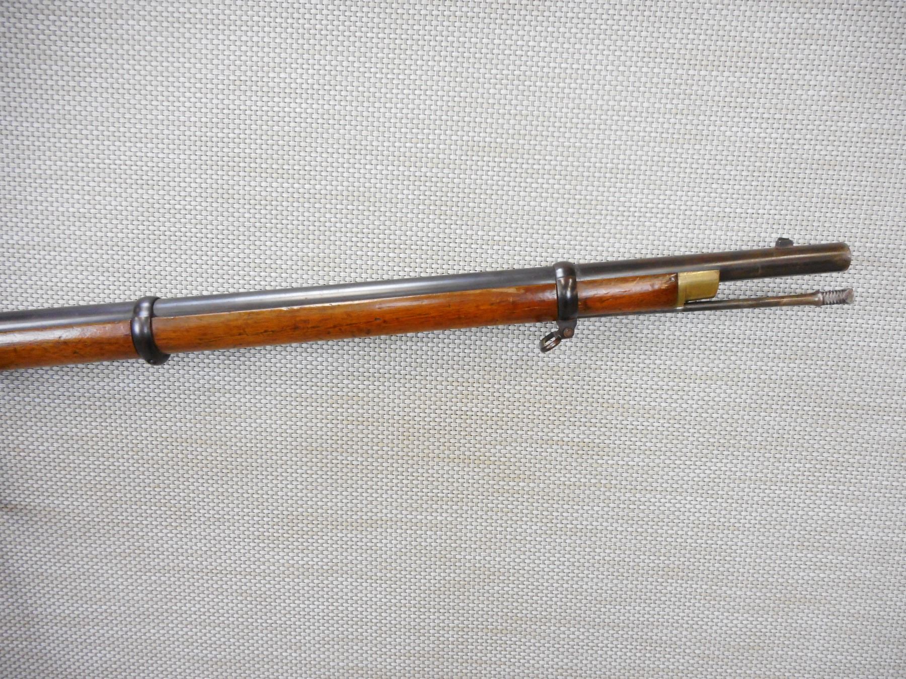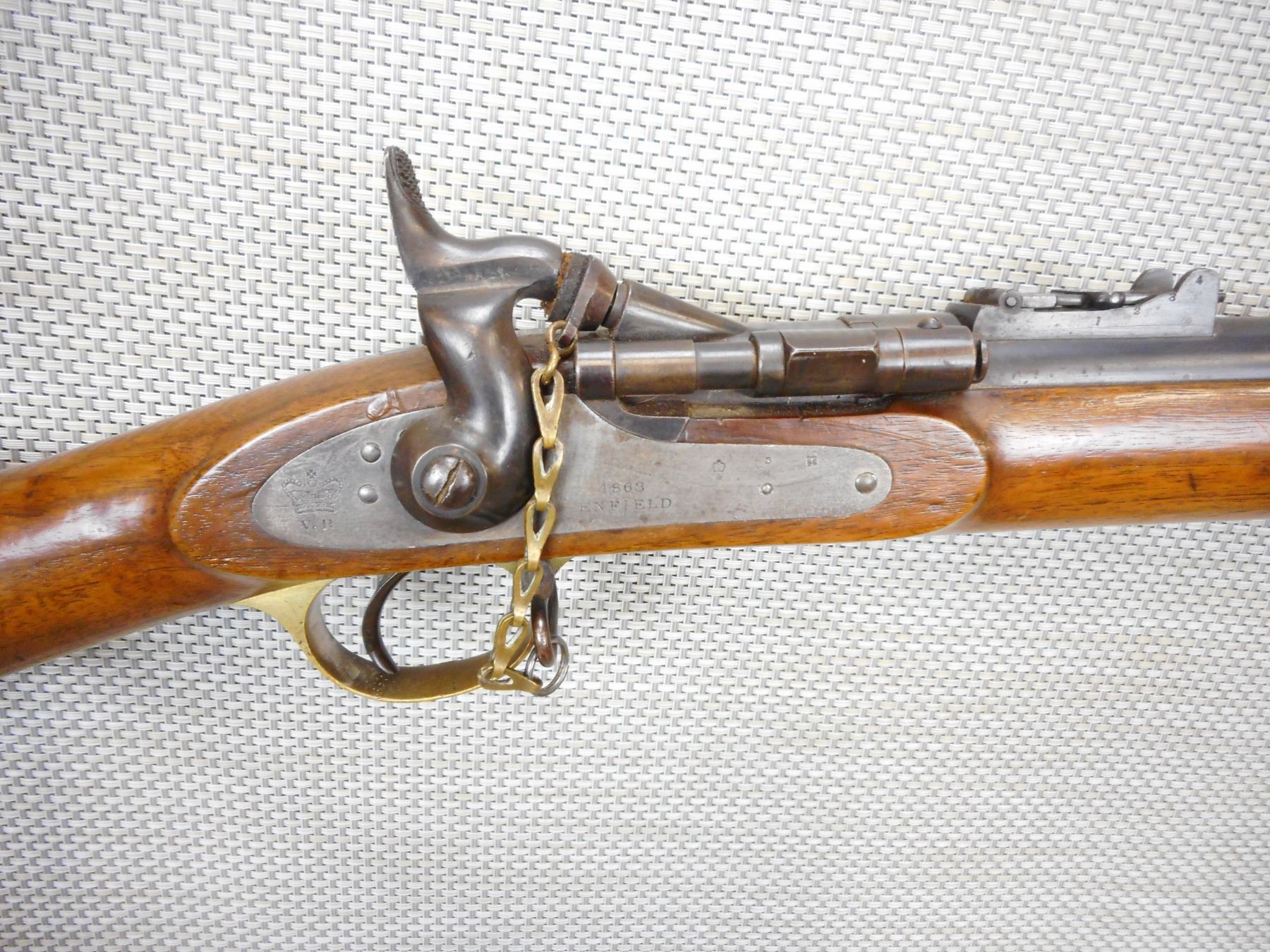 SNIDER ENFIELD , MODEL: III BAND INFANTRY MKII* , CALIBER: 577 SNIDER , ENFIELD MANUFACTURED, DC MARKED, DATED 1863, NIPPLE PROTECTOR AND CHAIN ATTACHED, SLING LOOPS, BRASS TRIGGER GUARD, BUTT PLATE AND NOSE CAP, CLEANING ROD INCLUDED , ACTION: BREECH BLOCK , BARREL LENGTH: 36 1/2" , CONDITION: , CLASS: CANADIAN ANTIQUE CLASS , STOCK # , SERIAL # N/A