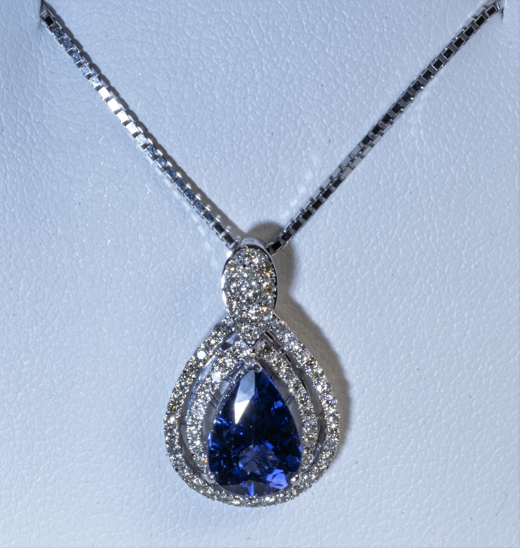 This Pendant from Baranof Jewelers is 1.89 Carats Total Weight of pear shaped Tanzanite and .42 Carats Total Weight of Diamonds. It is set in 14 Carat White Gold. Baranof Jewelers is located in Park City, Utah and has an extensive collection of Tanzanite jewelry.
