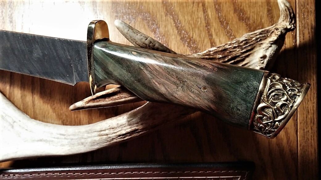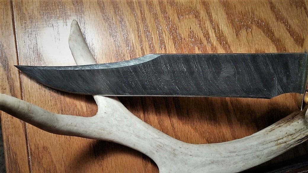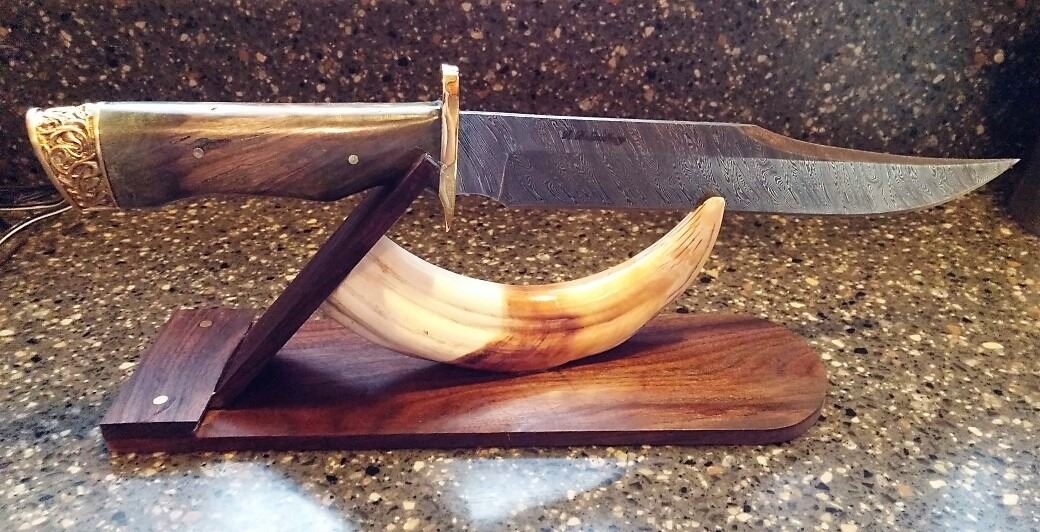 Donation: Large Firestorm Damascus Bowie complete with a display stand for the mantle that is a Warthog Tusk "U" shaped design