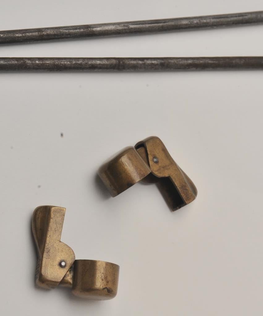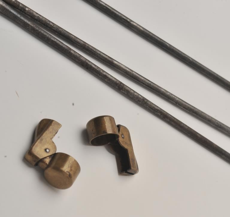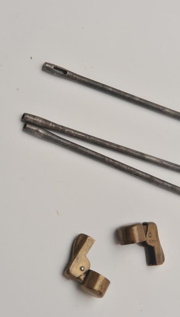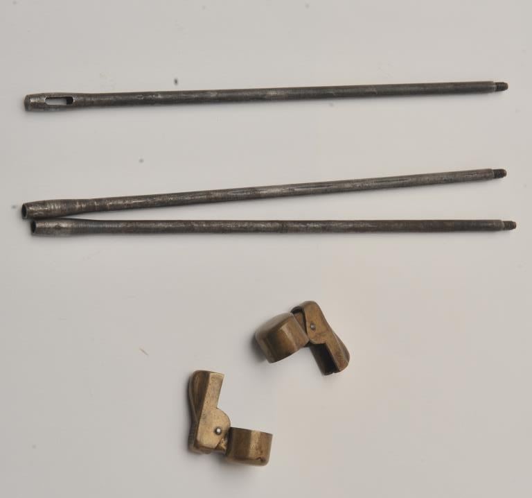 Three piece Krag rifle metal cleaning rod and two Krag rifle brass muzzle covers. Est.: $75-$125.