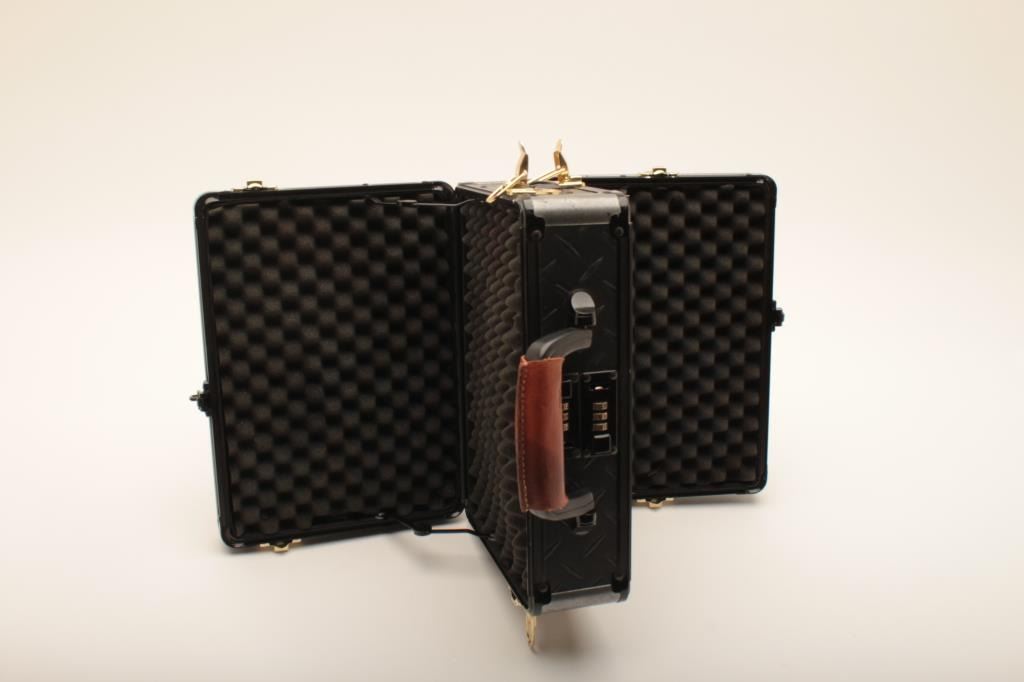 TZ Case Corp. four gun armored pistol case. The case is approximately 12 ½” x 9” with foam padded compartments on each side for two pistols. There are independent locks and latches on both sides of the case. The case is in very good overall condition. Est.: $25-$50.