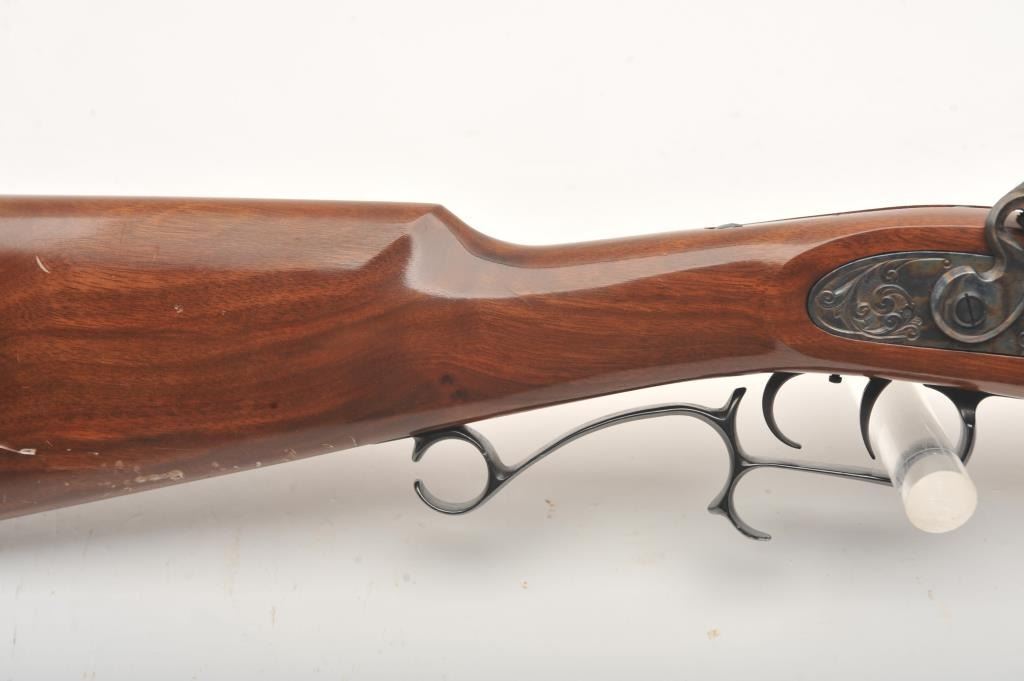 Thompson Center Arms reproduction of a flintlock half stock rifle, .50 caliber, 27” octagon barrel, blued and case hardened finish, double set triggers (working at time of description), wood stock, S/N 96339; overall very good to near fine condition with majority of original finish, crisp action and markings, very good wood with some scattered mars and scratches from storage; w/factory instructions. (flintlock). Est.: $125-$250.