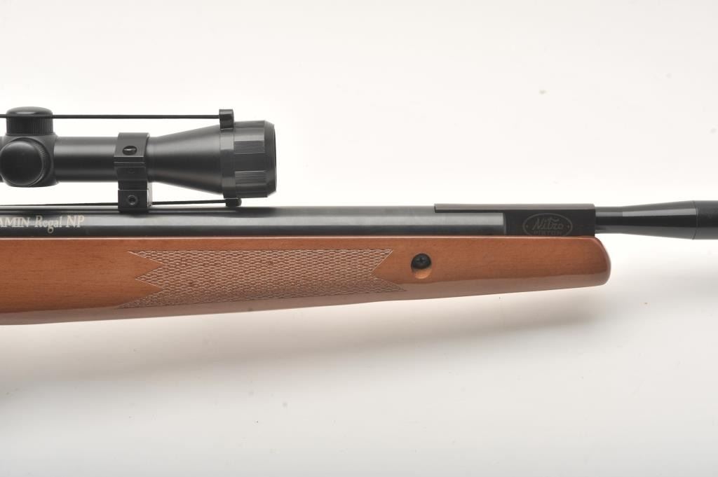 Benjamin Regal NP pellet gun, .22 caliber, 19” barrel, blued finish, checkered wood stock, S/N 014X10698; mounted with a Center Point scope displaying good optics; overall fine condition showing little if any use; several scattered mars to stock from storage. Est.: $125-$250.