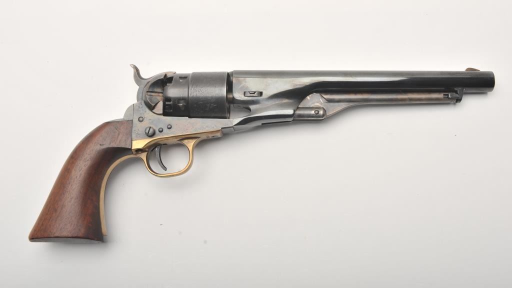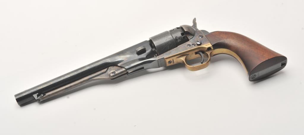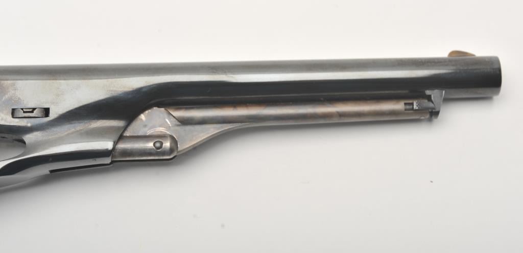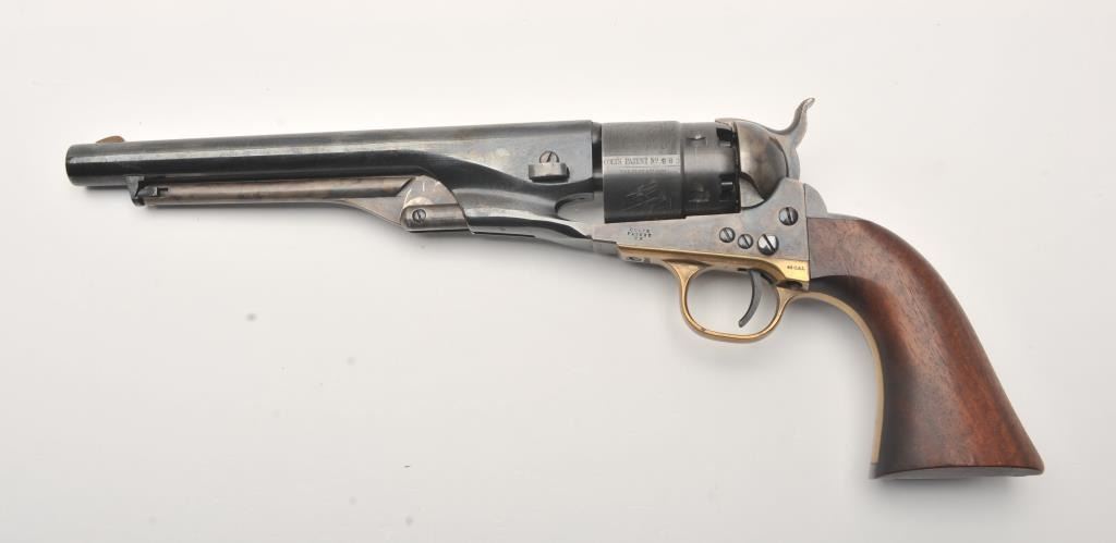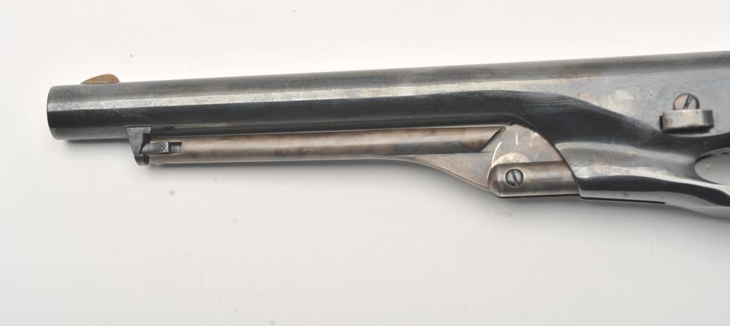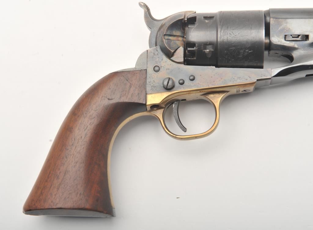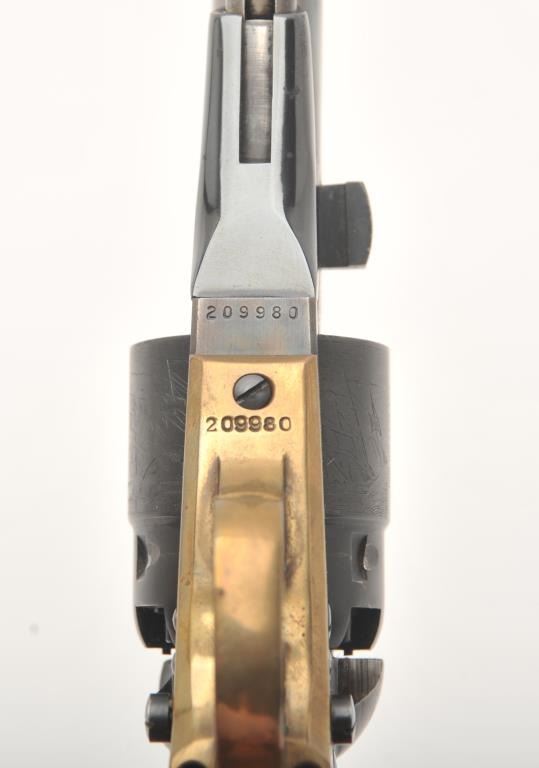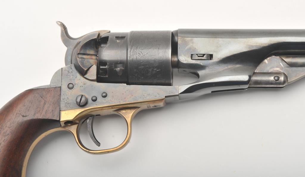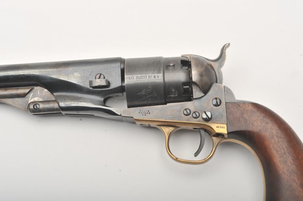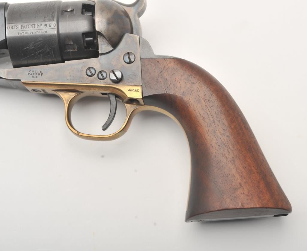 Colt New Black Powder Series 1860 Army percussion revolver, .44 caliber, Serial #209980. The pistol is in fine overall condition with an 8” barrel. The barrel and cylinder retain nearly all of their blue finish with 95% of the cylinder scene visible including the engagement date. The frame, rammer and hammer are beautifully case hardened. The smooth wood grips are in very good condition with only light storage marks. The bore is good, the action is crisp and markings are sharp. Est.: $450-$850.