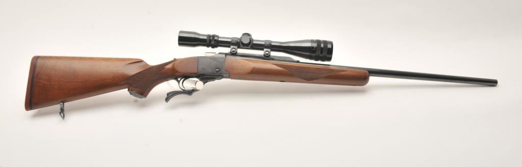 Ruger No.1 single shot rifle, .243 Winchester caliber, Serial #132-34368. The rifle is in very good overall condition with a 26” barrel. The metal surfaces retain the majority of their blue finish with small scratches and handling marks. The rifle features a desirable tang mounted safety. The checkered wood stocks are in very good condition with some small mars on the fore end. The butt ends with a red rubber Ruger marked recoil pad. The rifle is topped with Ruger rings and a Weaver V12-II variable power 4 x 12 rifle scope with an adjustable objective. The bore is good, the markings are sharp and action is functional. Est.: $400-$800. (Modern).