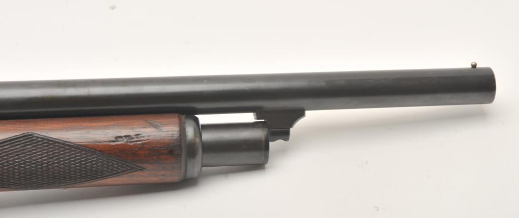 Very rare Stevens/Savage Model 620 U.S. military-marked pump action shotgun, 12 gauge, 20” barrel, military finish, P and flaming bomb proofs, checkered wood stocks, S/N 17313; overall very good to near fine condition with majority of military finish remaining on metal surfaces, near fine bore, crisp action, very good markings and stocks with butt stock displaying better-than-usual grain figuring. (C&R). Est.: $600-$1,200.