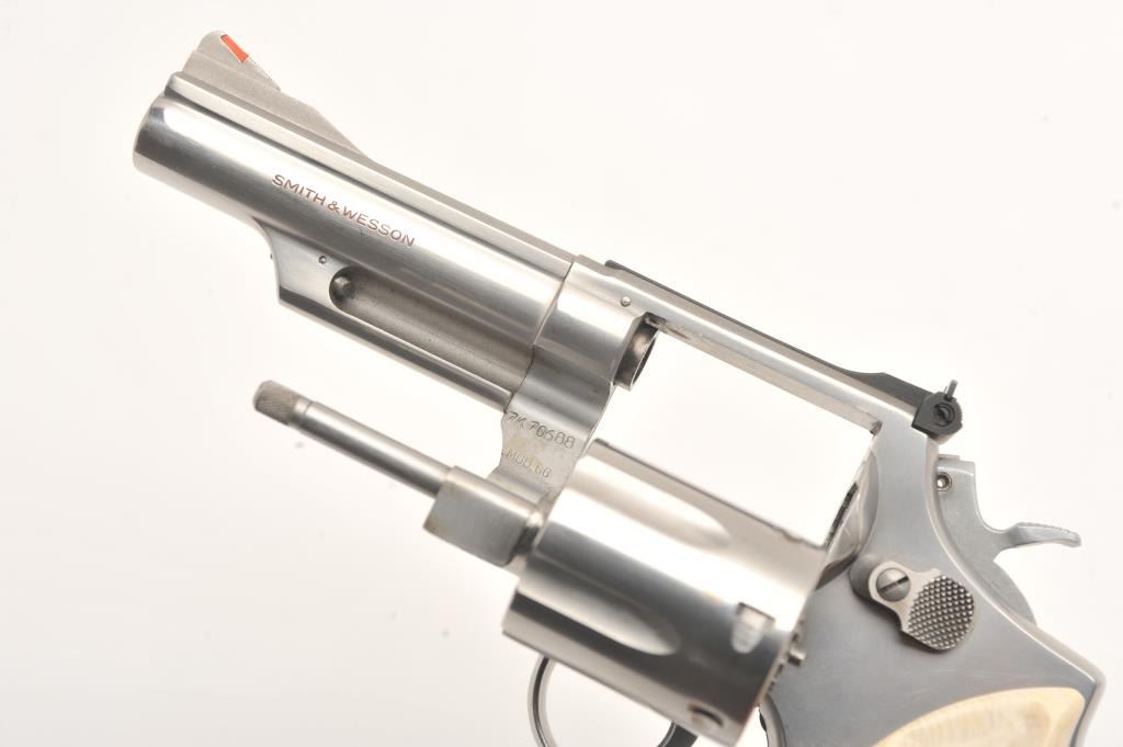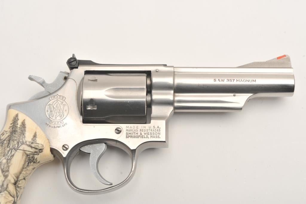 Smith & Wesson Model 66 revolver, .357 Magnum caliber, Serial #7K70688. The pistol is in very good overall condition featuring a 4â barrel with a ramped orange blade front and adjustable rear sights. The pistol retains the majority of its matte stainless steel finish with handling marks and a faint drag line on the cylinder noted. The grips are beautiful smooth marine ivory with a scrimshawed game scene, inlayed with Turquoise and signed, âWC SCHOTTS 80 No. 1 IN 1980â. The bore is good, the action is crisp and markings are sharp. Est.: $600-$1,200. (Modern/PPT).