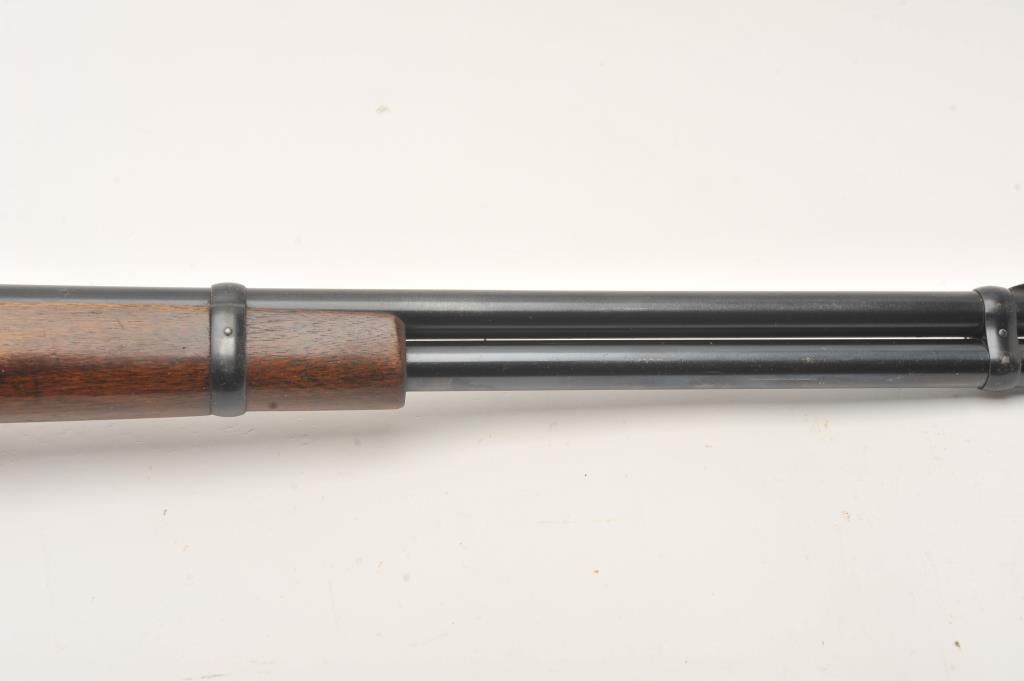 Winchester Model 94 lever action carbine, .30 WCF caliber, Serial #1341525. The rifle is in approximately 95% condition in the original factory cardboard box. The rifle features a 20” barrel with a full-length magazine. The metal surfaces retain nearly all of their original blue finish with light wear at the muzzle and small scratches from storage. The smooth wood stocks are in very good condition with only light handling marks. The carbine is in the original Winchester marked factory cardboard box, end label numbered to the gun with associated packaging material. The bore is good, the action crisp and markings are sharp on this outstanding Winchester circa 1942. Est.: $1,000-$2,000. (C+R).