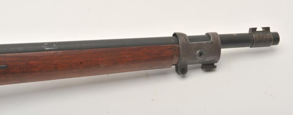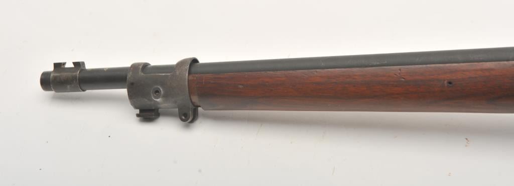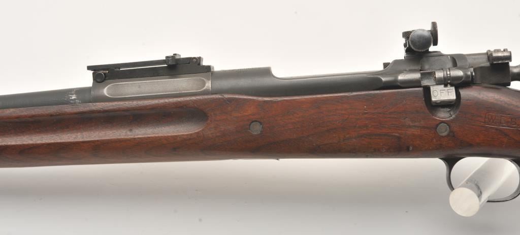 U.S. Springfield Armory Model 1903 bolt action rifle, .30-06 caliber, 24” SA barrel dated 4-21, front sight blade missing, adjustable Lyman receiver mounted sight, military finish, wood stock (missing wood hand guard), missing trigger, rear barrel band, floor plate assembly and possibly some small internal receiver parts, S/N 1230998; majority of military finish remaining, good bore, good markings, wood stock shows circle P proof and W.E.S. inspector’s cartouche; stock is good overall with area of wood under bolt handle showing an old repair; butt trap contains cleaning kit tube. (C&R/NO PPT). Est.: $300-$600.