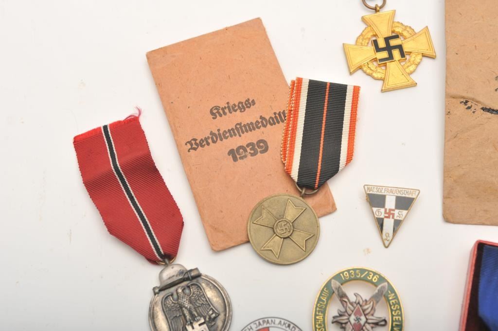Lot of eleven WWII Nazi medals from an old time collection. The lot includes eleven separate Nazi medals, two of which come in the original packaging. Several are dated 1939 and features hallmarks on the reverse. The lot includes campaign ribbons and party affiliation items. A great assortment from an old collector. Est.: $300-$600.