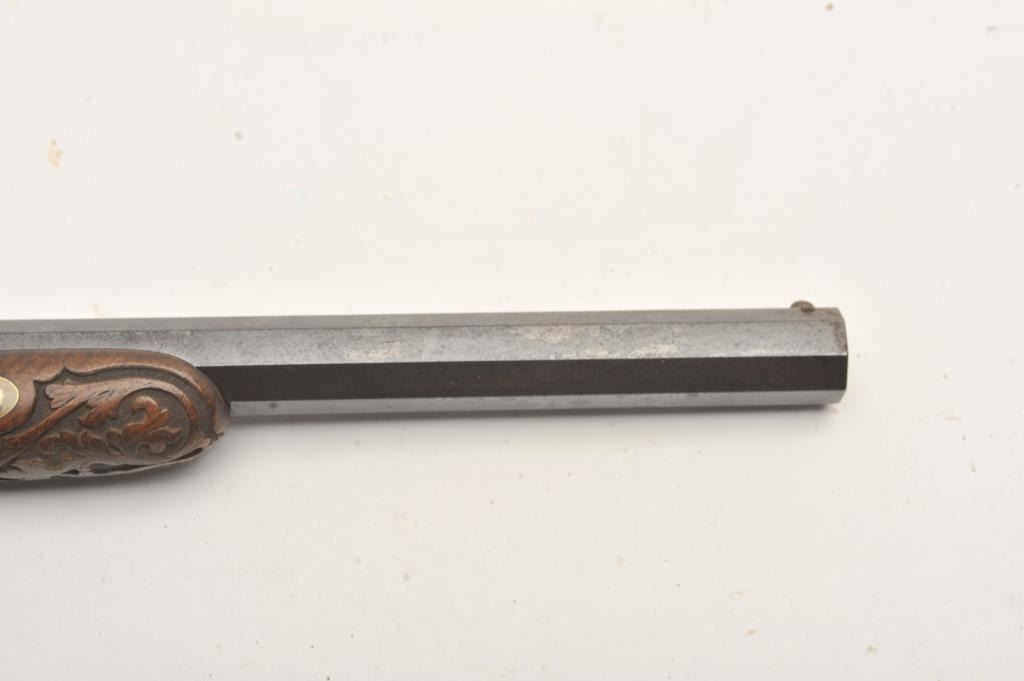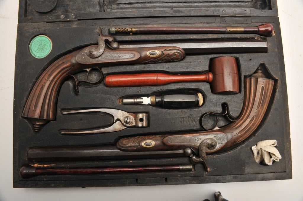Cased pair of French Dueling Target Pistols signed in gold “Zaque A Marseille” on barrels with 10” octagon barrels of .48 caliber rifled. Measures 16 ¾” overall with fluted and carved light colored walnut stocks. Engraved locks and mounts showing traces of subtle case hardening and browned barrels. Very good condition with some slight pitting on barrels and minor wear to stocks. The actions are crisp and work well. In an unusual but utilitarian carved wood fitted case with mold, combo tool, mallet, rods and caps. The exterior of the case is oak with simple brass carry handle and hook style latches and key plate. The lid is warped and the box is somewhat scratched and aged. A good set by a more “Rural” French maker. (Antique) Est.: $2500-$5000