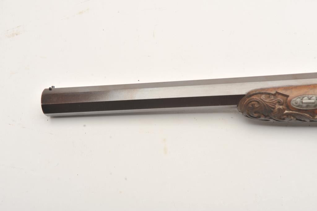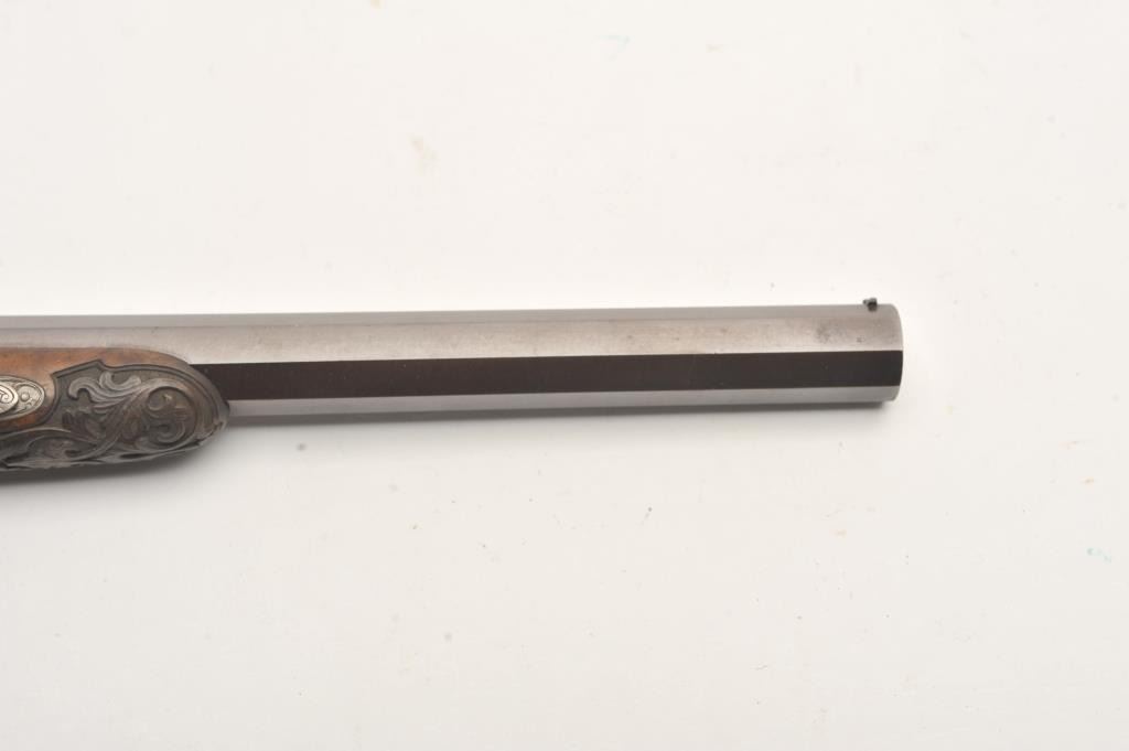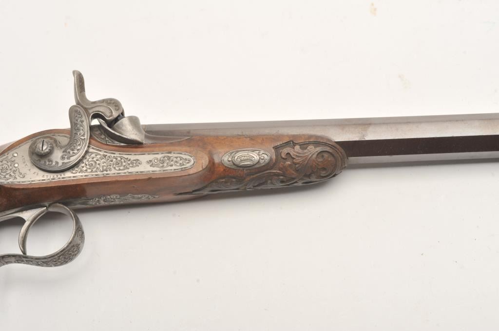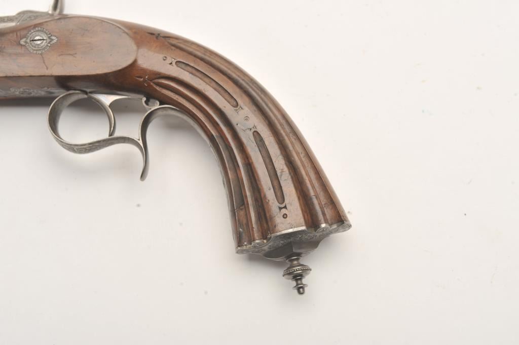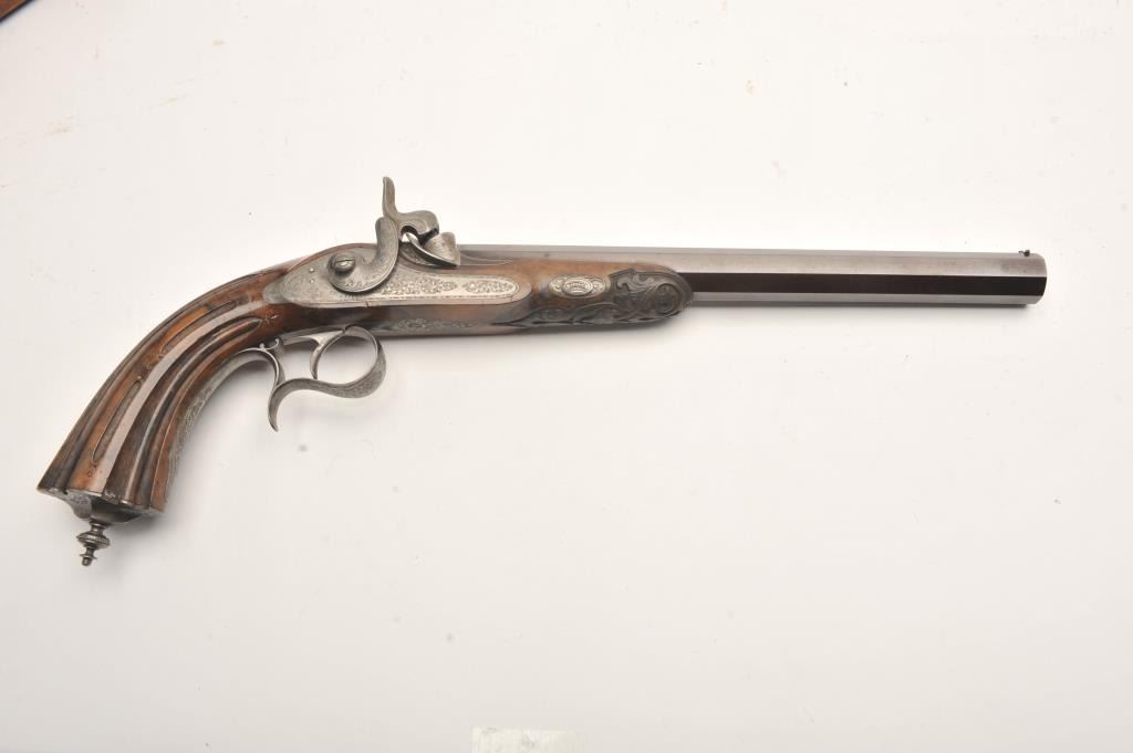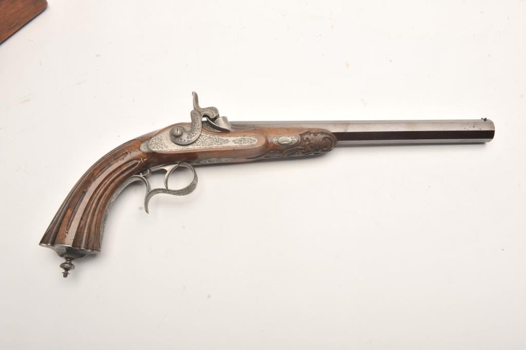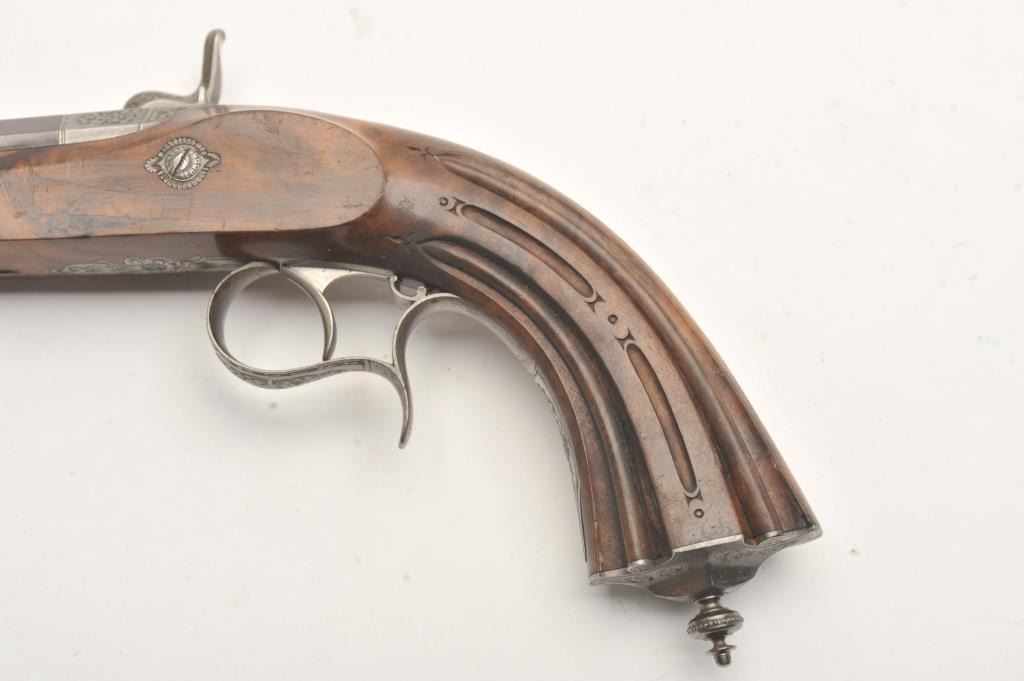 Fine dueling set signed “Aury a St. Etienne” with gold inlaid “Cannon Damas” on barrels. The case shows provision for 2 duelers and 2 second pistols (1 is missing and the mold is also lost). The dueler/target pistols measures 16 ¼” overall with 10 ¼” barrels in .50 caliber rifled. Half stocked in quality light colored wood showing classic fluted and carved stocks. Browned barrels with French gray or satin finished locks and mounts. Pistols are very good plus to almost fine showing just slight and normal aging. The one remaining seconds pistol is almost .50 caliber with 2 ¼” screw barrel and folding trigger. Measures 7” overall with ebony stock and light engraved. Bright polished finish with Belgium proof on breech. Fine to excellent condition. The original case is lined in green felt or baize and is fitted closely in French style. The case is near fine with just minimal aging and slight wear at contact points. As stated the mold is missing and 1 seconds pistol. Flask, combo tool for small pistol, cap box, mallet, large combo screwdriver, nipple wrench and rods