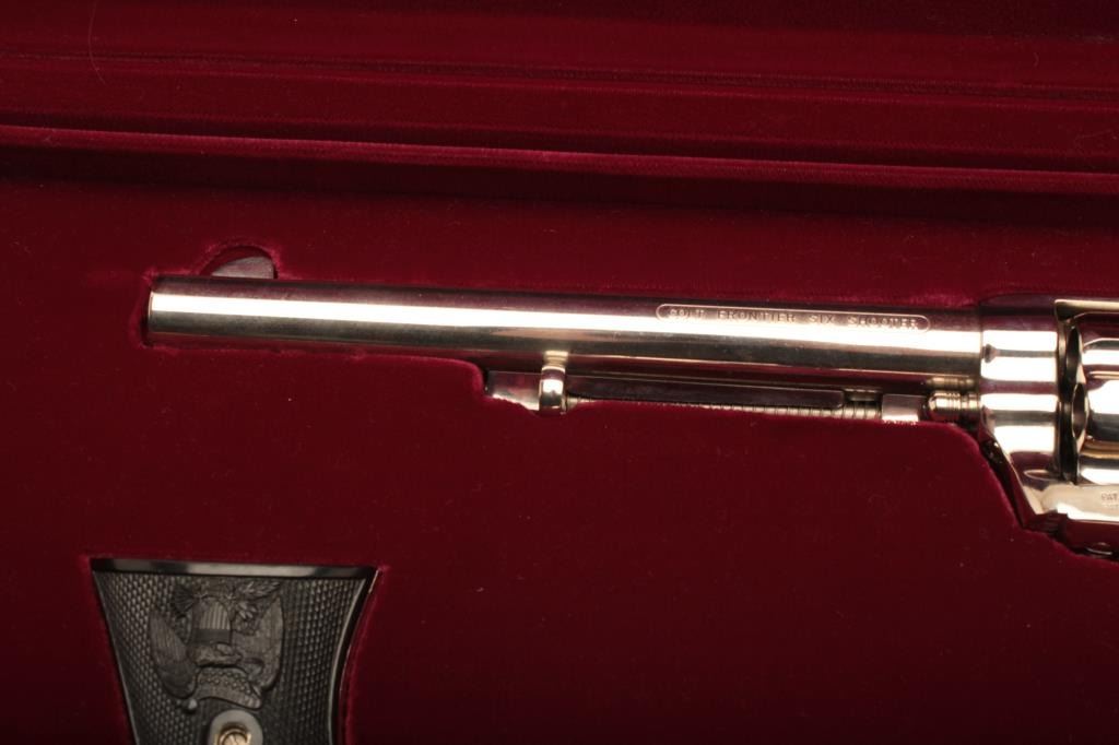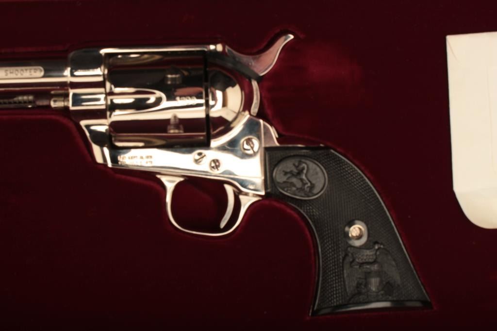 Colt Peacemaker Centennial pair of Colt SAA revolvers, .44-40 caliber, 7.5” barrels, nickel finish, checkered black eagle grips, consecutive S/Ns 1208PC and 1209PC with original wood grain factory cardboard boxes and inserts and accompanied by a wooden presentation Colt double case. Guns are like new in condition and a great collector’s pair of Peacemakers! (Modern/PPT). Est.: $3,000-$6,000.