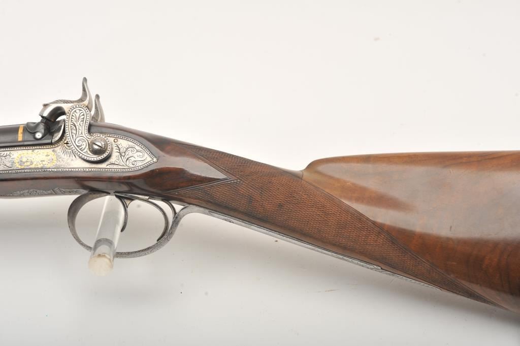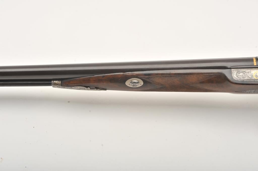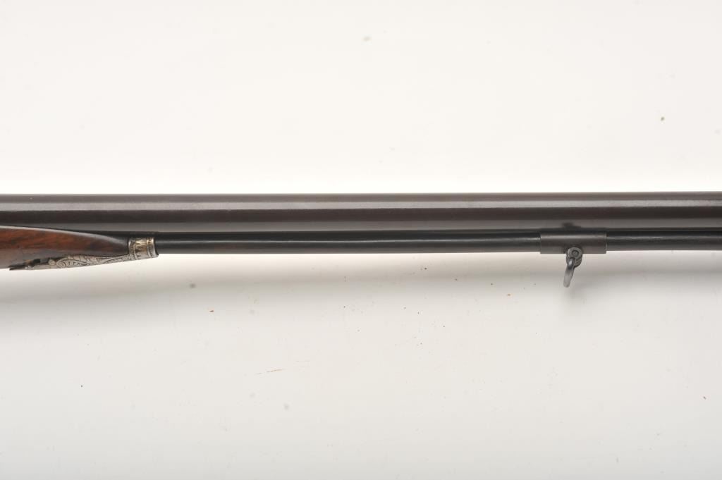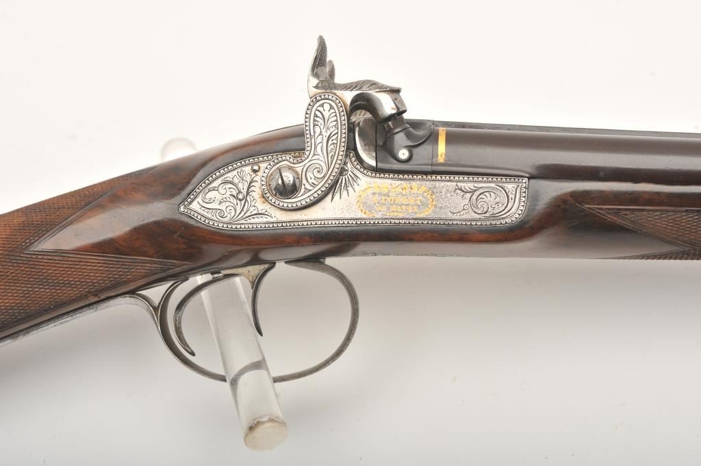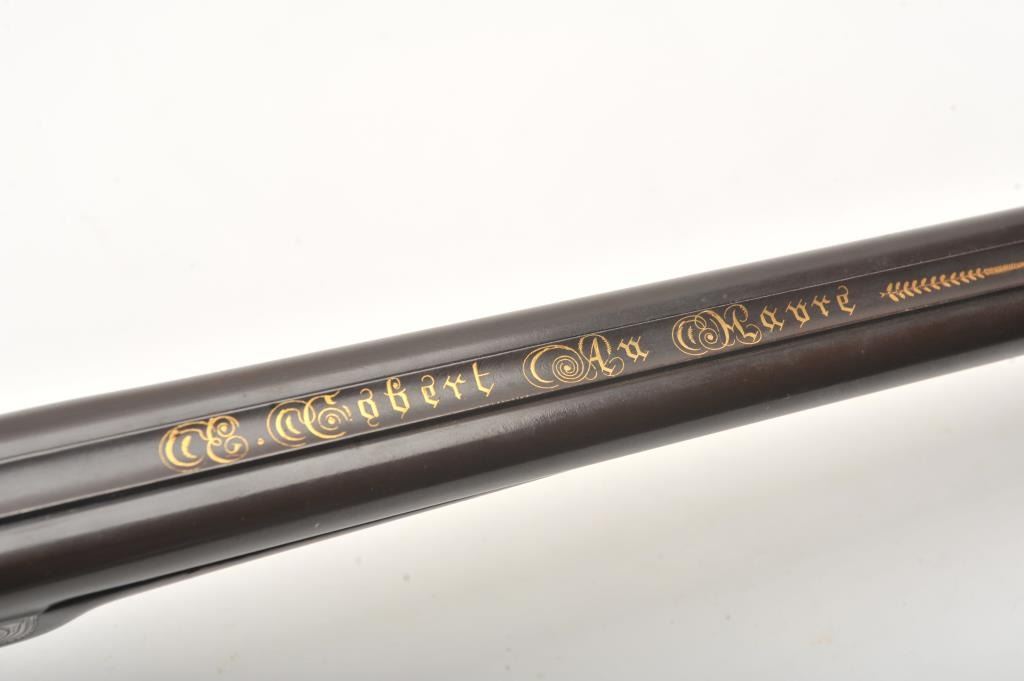 SxS 16GA shotgun ornately signed in gold on the barrels and locks “E. Cobert Au Havre”. Shows a museum quality European restoration to fine condition. Measures 48 ½” overall with 32 ½” barrels. Locks work crisply and a very good looking gun. (Antique) Est.: $1000-$2000