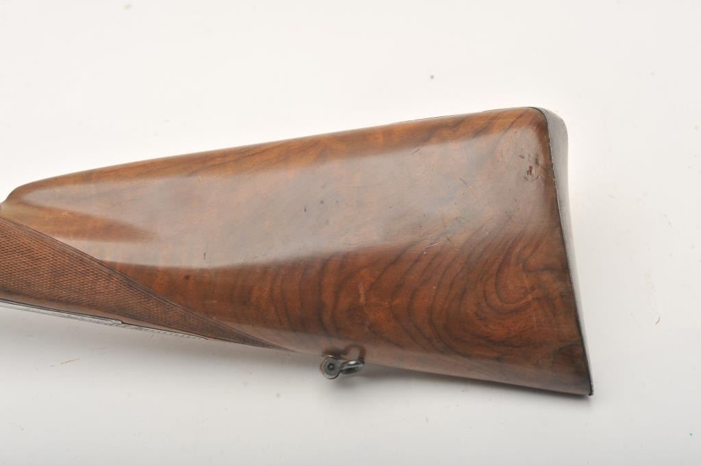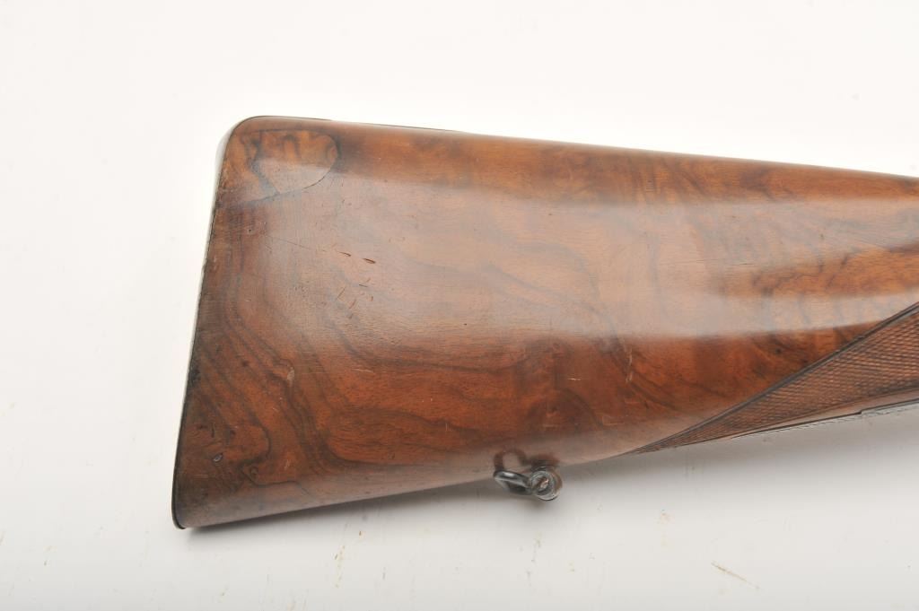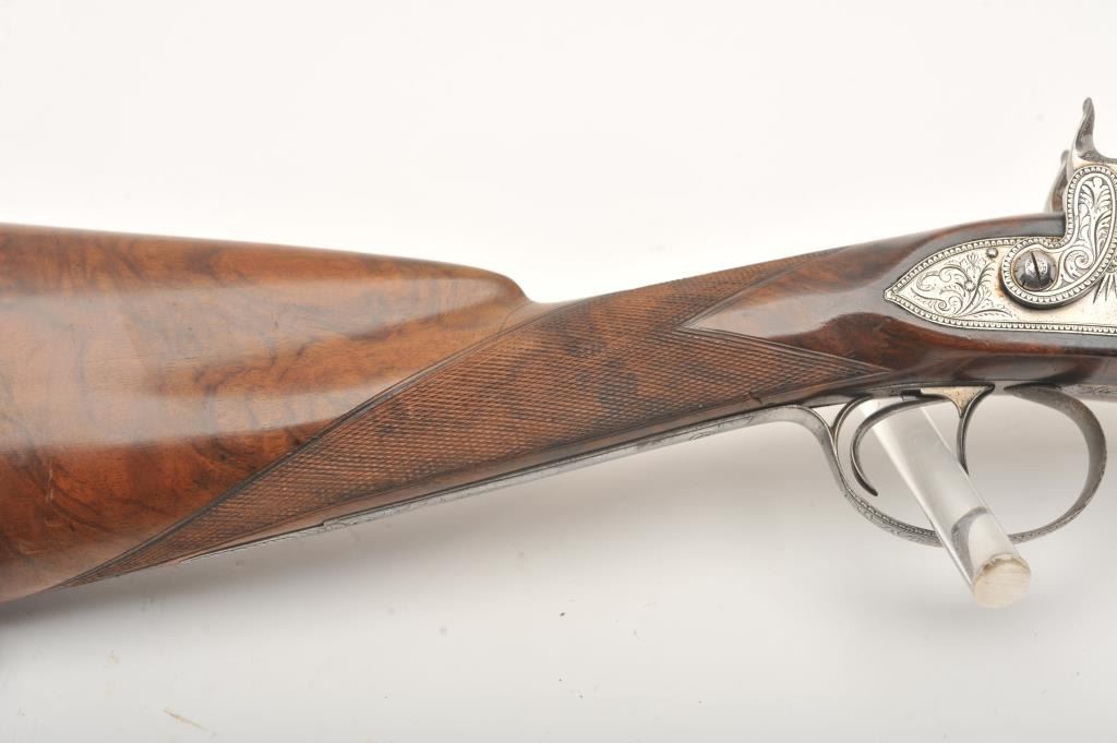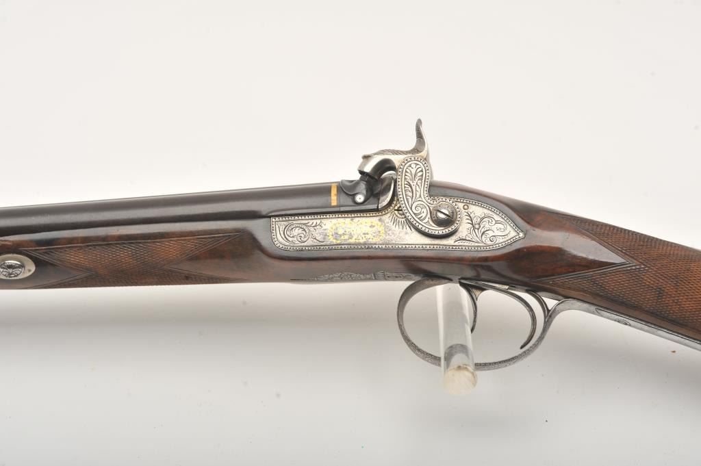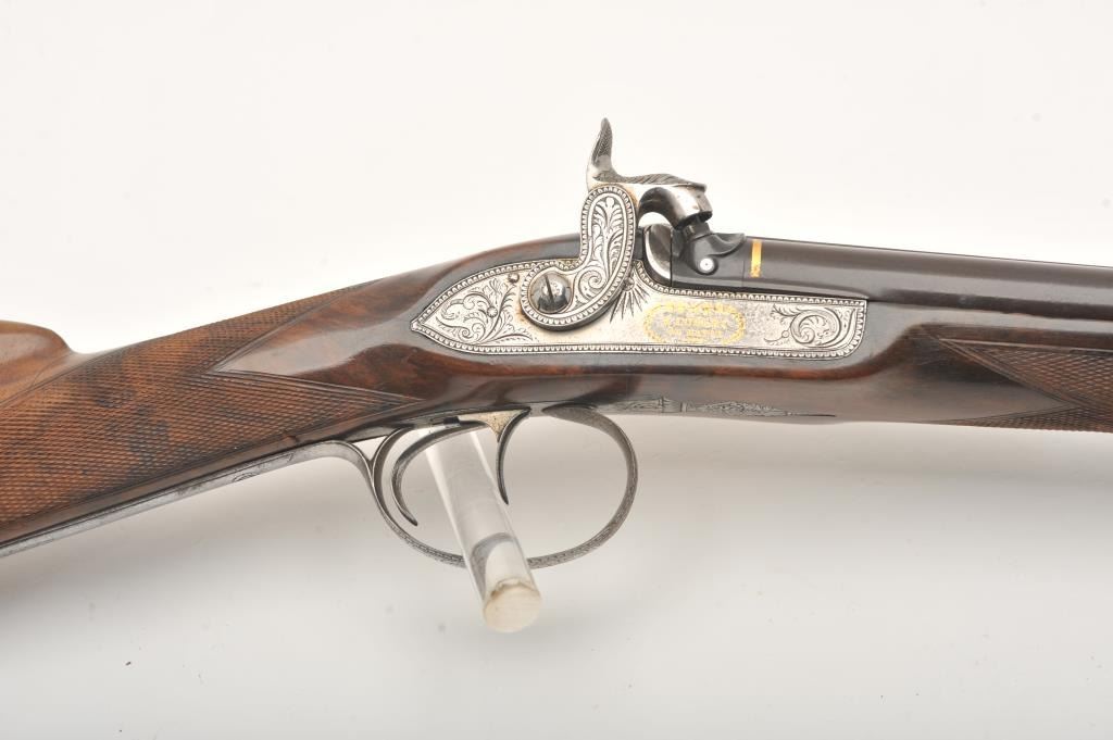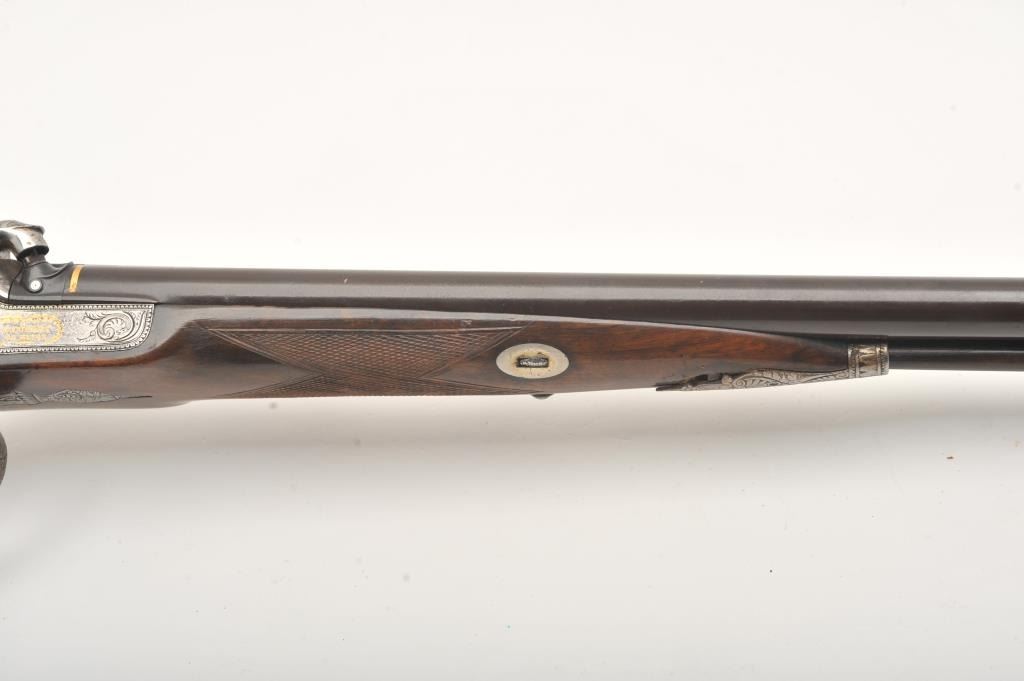 SxS 16GA shotgun ornately signed in gold on the barrels and locks “E. Cobert Au Havre”. Shows a museum quality European restoration to fine condition. Measures 48 ½” overall with 32 ½” barrels. Locks work crisply and a very good looking gun. (Antique) Est.: $1000-$2000