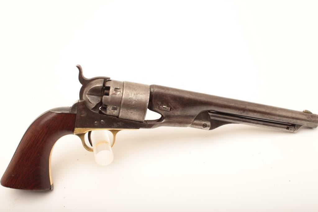 Colt Model 1860 Army revolver in .44 caliber percussion, S/N 131257 with original flap holster. The Army remains in original very good condition with 30%-50% original blue on the barrel with some minor light rust and pinprick pitting. Good sharp barrel address and minor scratches and dings by wedge. 75%-85% original and colorful case hardening on frame. 50%-70% on loading lever with traces on hammer. Cylinder shows 70%-80% scene with refined Colt’s patent and engagement dates. Cylinder has gone to gray metal. All matching visible serial numbers. The barrel shows “D” inspection as does the cylinder. “H” on backstrap, trigger guard, and bottom of left grip. The grips have been rubbed or cleaned very slightly and at least very good. Tight and very well preserved. An unmarked Civil War era flap holster is included. From the collection of Dr. Cairns and in storage for decades. (Antique) Est.: $3000-$6000
