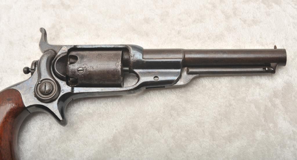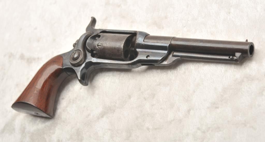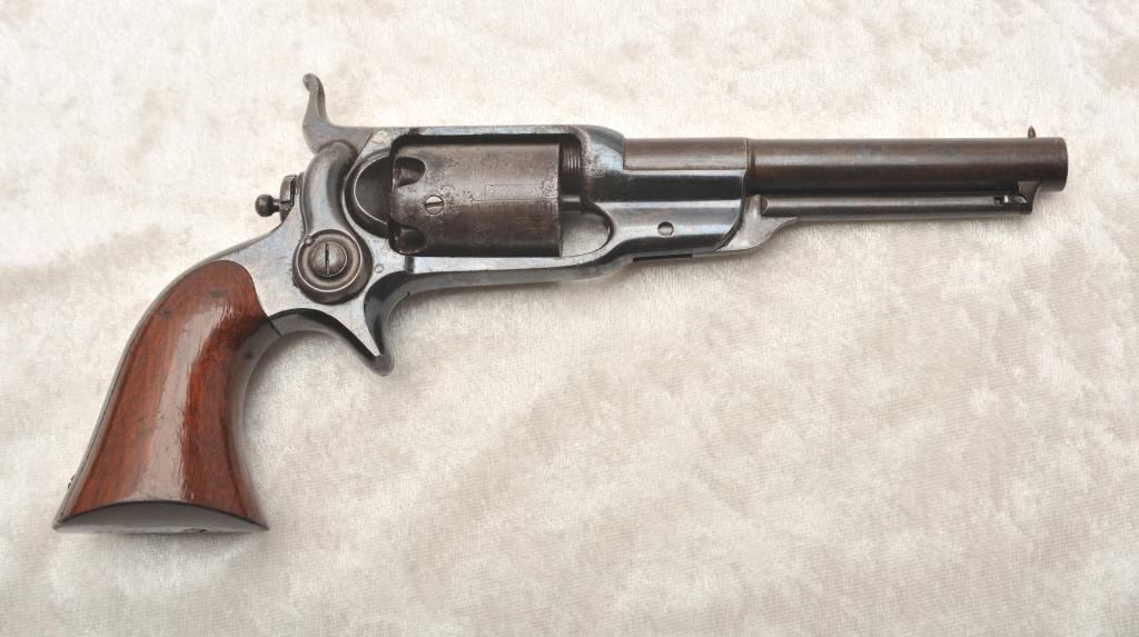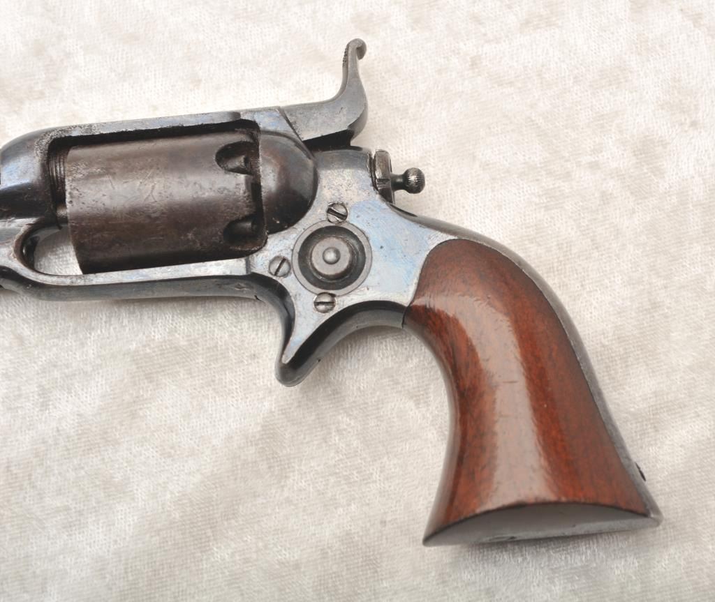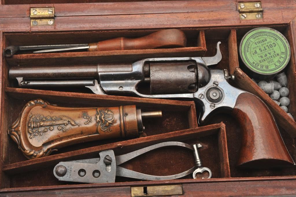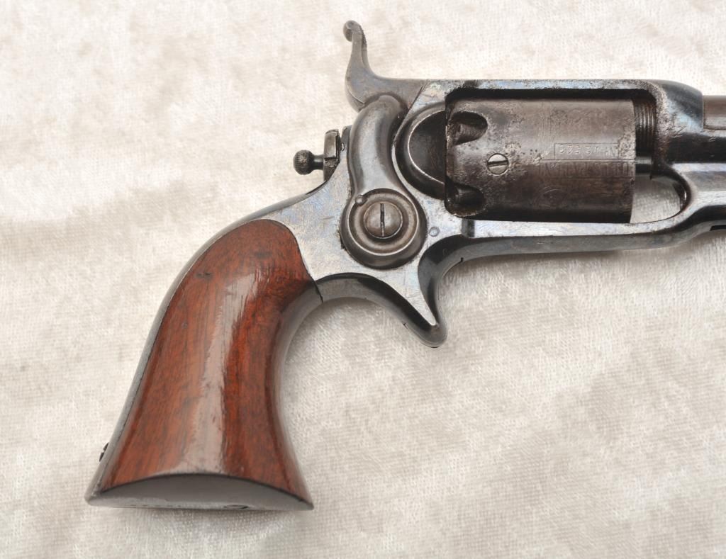 Desirable Colt Root Model 7A .31 caliber percussion revolver, S/N 12549 with a 4 ½” barrel, fluted cylinder and in original case with accessories. This Root remains in original near fine condition with 70%-80% original blue finish drifting to plum on the barrel and cylinder but very bright and “Inky” on the frame. Good sharp markings and crisp overall with some light to moderate pitting on the cylinder. About 50%-60% light original scene and shows the ‘Screw in cylinder” as proper on this variation. The grips are near excellent with 85%-95% original varnish and a miniscule loss at the left heel with slight aging. Crisp action and good overall appearance. A good peacock flask, correct mold, cap tin and screw driver included. The case is very good plus overall condition and is authentic to the period. Provenance: The award winning Colt Collector’s Association member Malcolm R. Burnette Collection and author of “A Collector’s Guide to The Colt Root Sidehammer”. (Antique) Est.: $5,000-$10,000