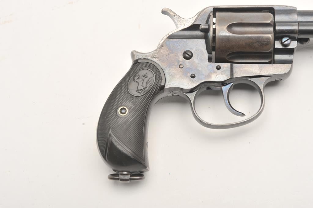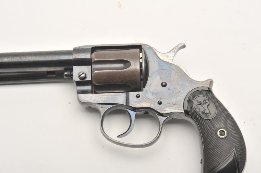 Colt 1878 double Action Frontier Revolver with etched “Colt Frontier Six Shooter” 7 ½” barrel in .44-40 caliber, S/N 15914. This revolver shows 60%-80% original toning blue with full etched panel patinaed slightly dark. Bright fire blue on hammer and trigger. Sharp and crisp grips that are at least very good plus. The front sight is its full dimensions. Factory letter confirms caliber and the barrel is listed as 5 ½” (Probable mistake), shipped to J.H. Ashdown, Winnepeg, Canada, Sept. 22, 1885, 2 guns in shipment. Letter included. Crisp action and bright bore. Strong 8.5 on a 1-10 scale. (Antique) Est.: $4000-$8000