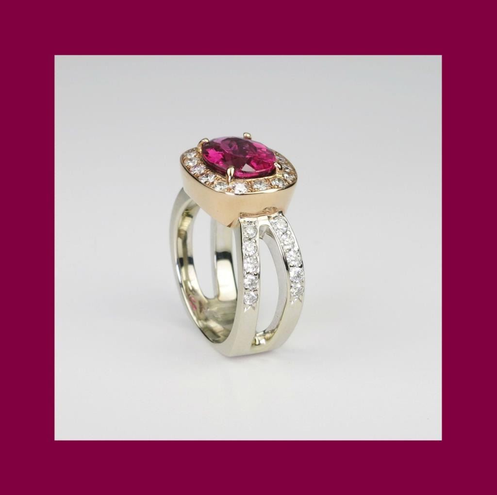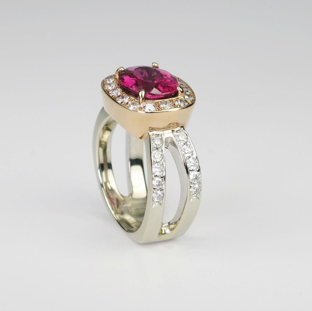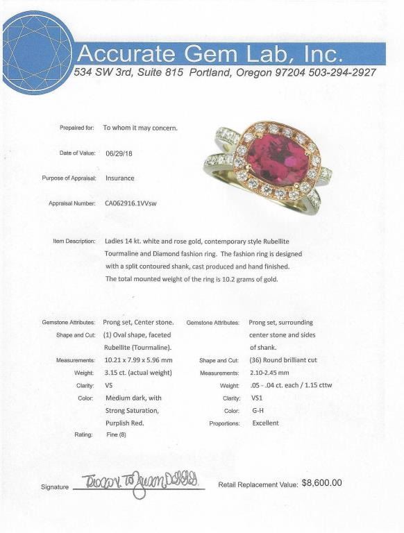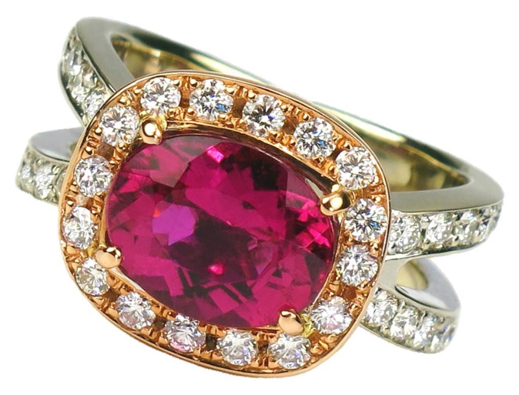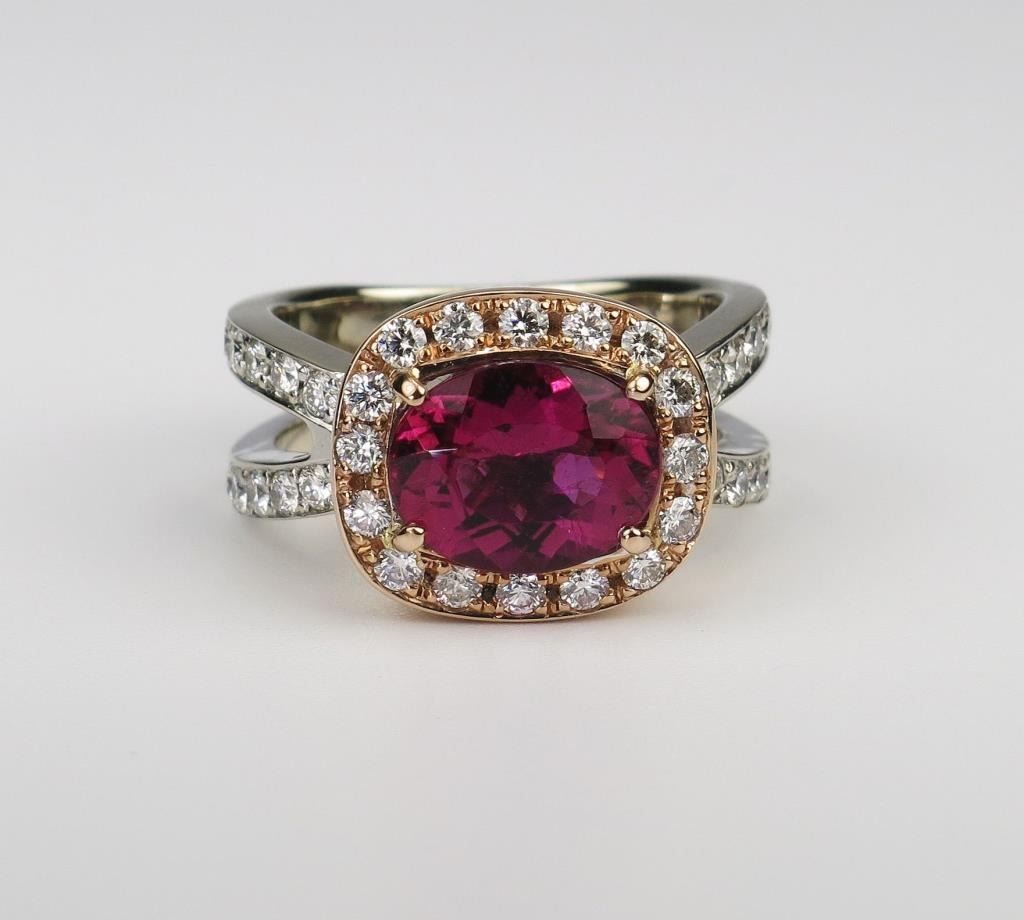 Glamorous Custom Rubellite and Diamond Ring featuring a Fine Quality oval cushion cut Rubellite with intense purple pink color and VS clarity weighing 3.15 carats accented with 36 round cut Diamonds weighing 1.15 carats with G-I colors and VS clarity crafted in 14 karat rose and white gold. Full Appraised Value $8,600.00 Estimate $4,000-$6,000