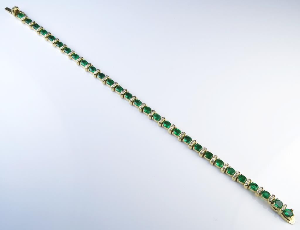 Fine Emerald Bracelet featuring over 29 oval Colombian Emeralds weighing approx. 9.00-10.00 carats and approx. 0.50 carats of G-H colors and VS clarity in 18 karat yellow gold. Retail $10,000-$15,000 Estimates $6,000-$8,000