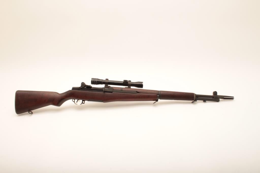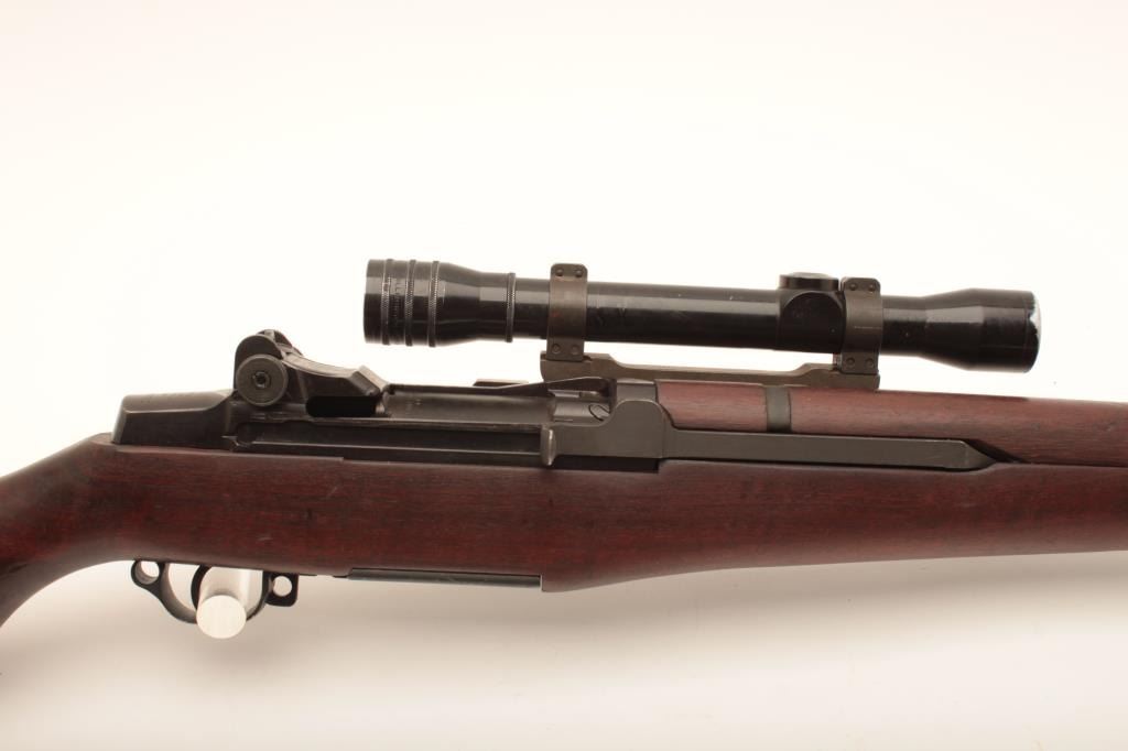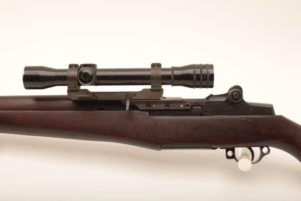 U.S. Springfield M1C-52 Garand semi-automatic rifle, .30 caliber, 24” barrel dated SA 2-55; S/N 3349030; bore and action are good, markings are crisp; military finish is very good overall, stock is very good showing use and normal handling marks and is an H&R stock with small cartouche and circle P proof; mounted with a Stith-Kollmorgen scope displaying good optics with scope showing use and handling; also present is a prong flash hider; accompanied by a CMP certificate. reproduction scope case and original mount require minor fitting. (C&R). consecutive serial number to lot 222 Est.: $2,000-$4,000.PG cartouche.