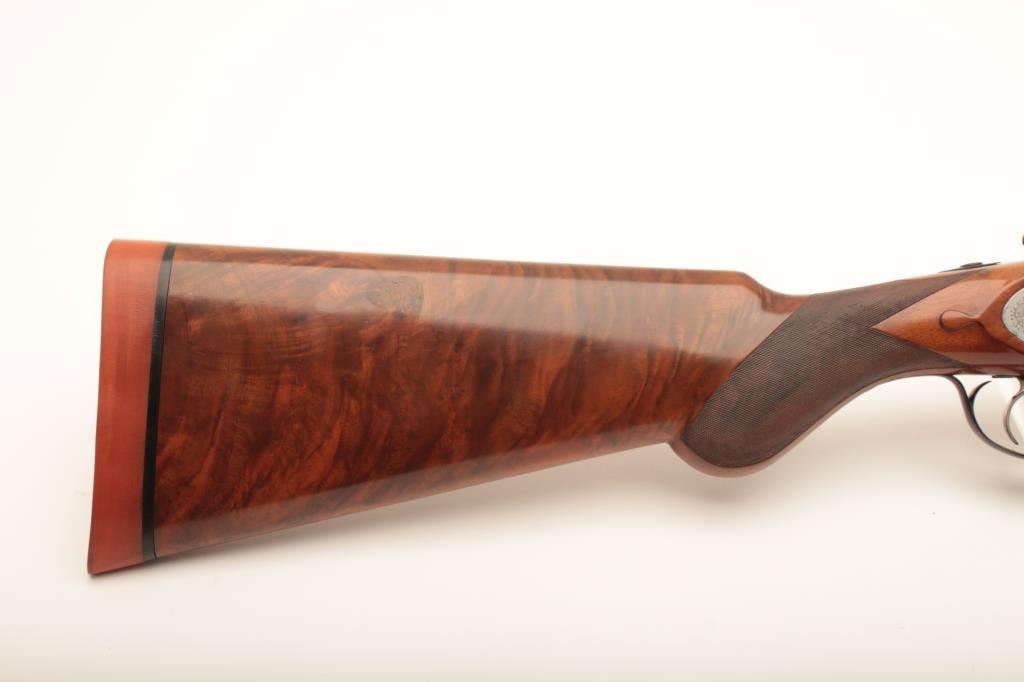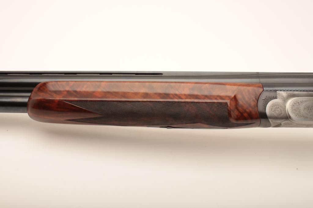 Perazzi Over/Under shotgun two-barrel set, 12 gauge, Serial #5394. The shotgun is in fine overall condition with 26” and 30” barrels in a leather covered Perazzi trunk case. The 30” barrels retain nearly all of their blue finish with a full-length ventilated rib. The 26” barrels also feature a full-length rib with wear at the muzzle and small mars from carry and use. The 30” barrels are marked with gold “I” at the breech and the 26” are marked with gold “II”. The receiver is tastefully coin finished and features approximately 80% coverage in attractive engraving. The shotgun has a single trigger and tang mounted safety. The finely checkered stocks show outstanding fit and finish with significant figure and a Prince of Wales pistol grip. The butt ends with a red rubber recoil pad providing a 14 ½” LOP. The bores are good, the action crisp and markings are sharp. The two-barrel set is cased in a leather and canvas Perazzi trunk case with red baize interior. Est.: $14,000-$28,000. (Modern).