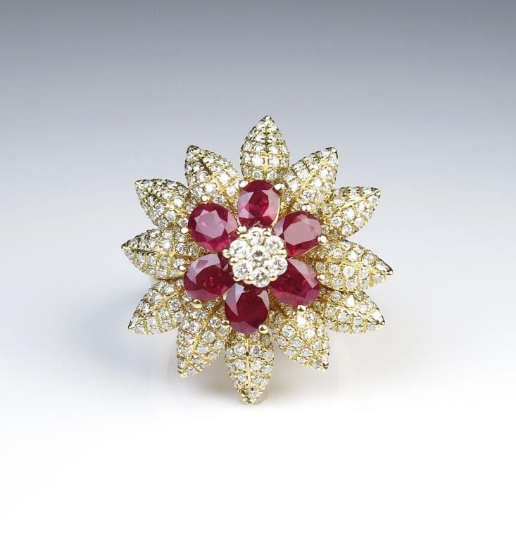 Glamorous Ruby and Diamond Cocktail Ring featuring a marvelous flower design featuring 6 Fine Burmese Rubies weighing approx. 3.00 carats accented with over 247 round cut Diamonds weighing approx. 3.00 carats of G-H-I colors and VS/SI clarity pave set in 14 karat yellow gold setting. Retail $8,000-$12,000 Estimate $4,000-$6,000