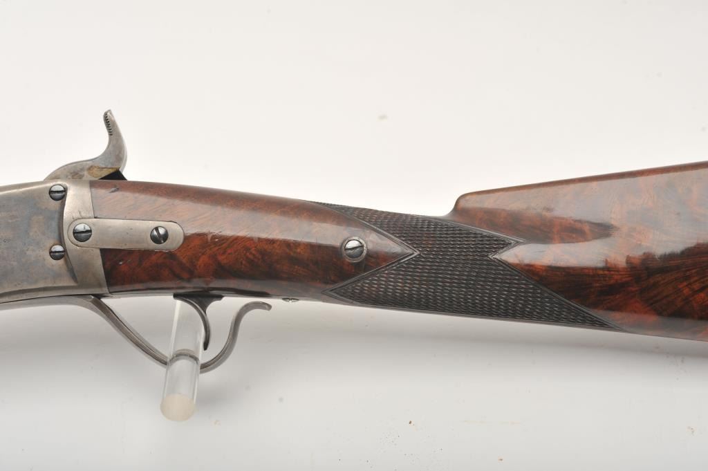 Peabody Sporting rifle by Providence Tool Co. (Slotterbeck style with brass-tipped wood cleaning rod and pewter forend cap), .44 caliber, 29” barrel, blued and case hardened finish, checkered wood stocks with beautiful graining to butt stock, no visible S/N; overall fine condition showing majority of original finish to metal surfaces, near fine bore, crisp action and markings, near fine wood stock with some minor spots of wear to finish on right side of butt stock. (Antique). Est.: $1,500-$3,000.