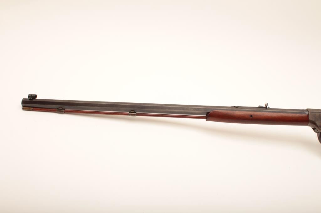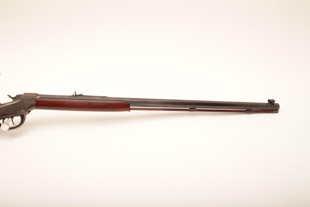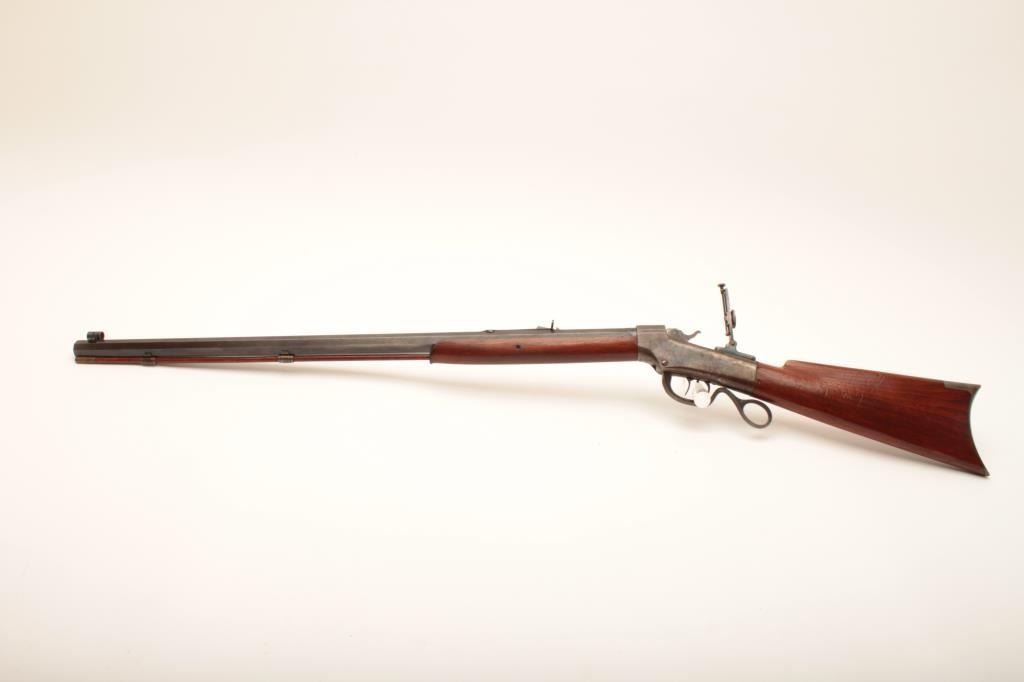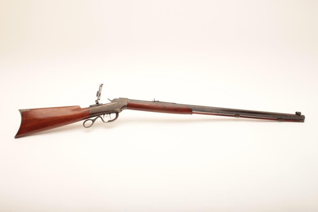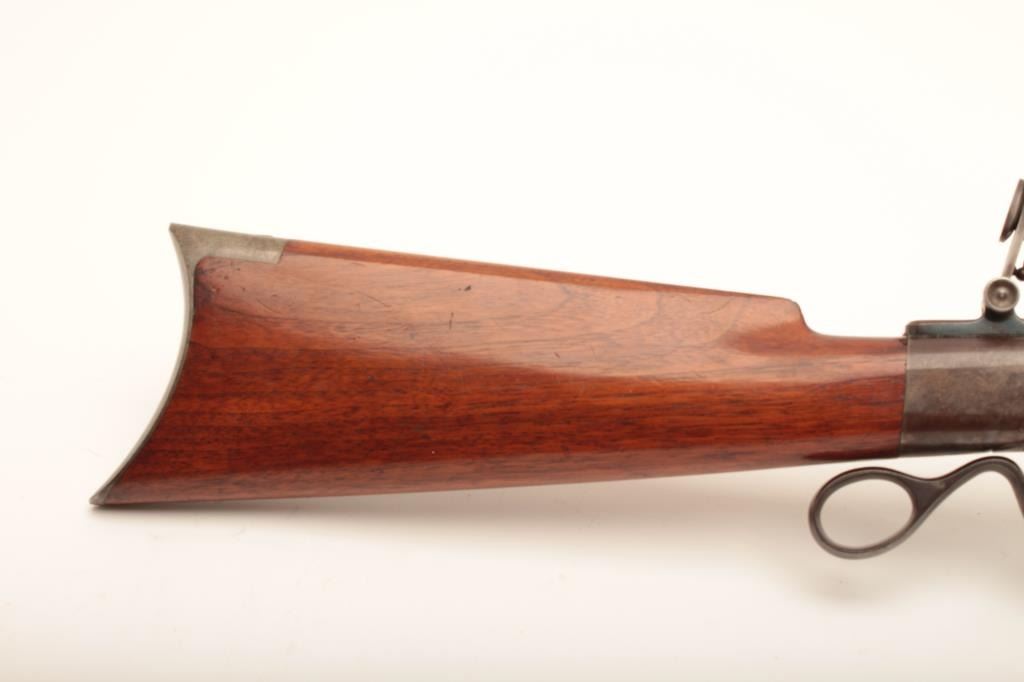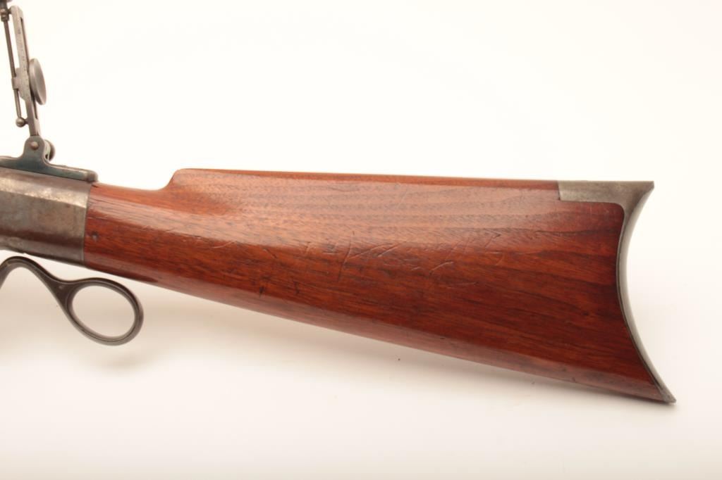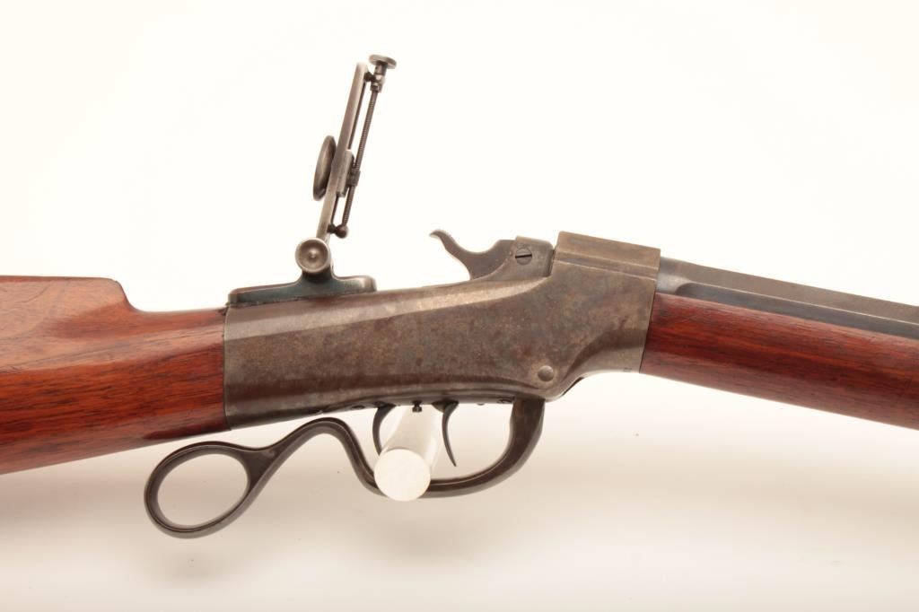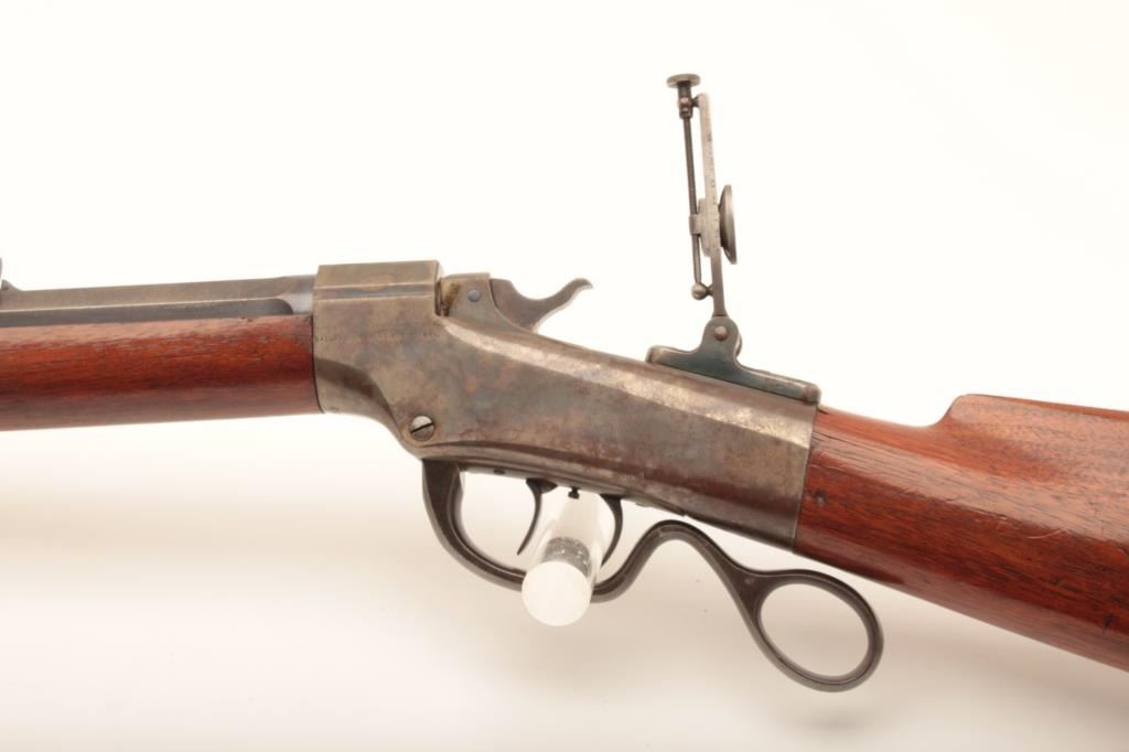 Ballard Pacific single shot rifle, .38-55 caliber, 30” octagon barrel, blued and case hardened finish, wood stocks, double set triggers (working at time of description), brass tipped cleaning rod, adjustable flip-up tang sight, adjustable rear buckhorn sight and hooded front sight, S/N 20713; overall very good to near fine condition with majority of muted original blued finish on barrel, considerable original case colors on receiver, crisp action, sharp markings, very good bore and very good wood stocks. (Antique). Est.: $1,250-$2,500.