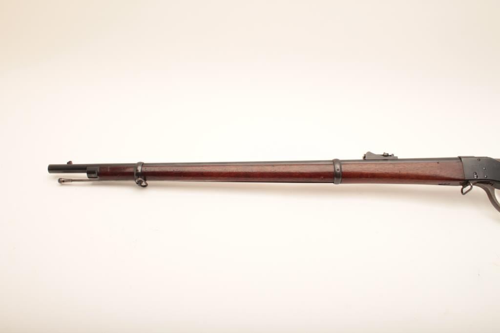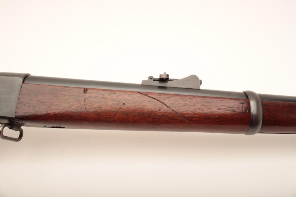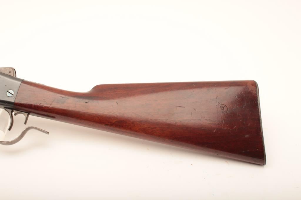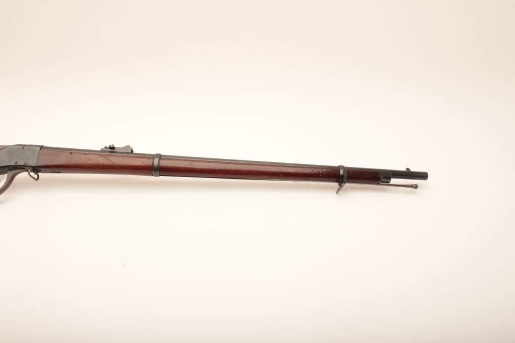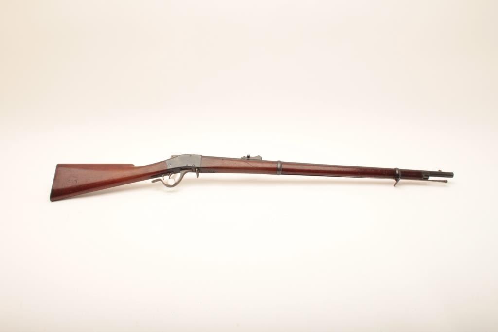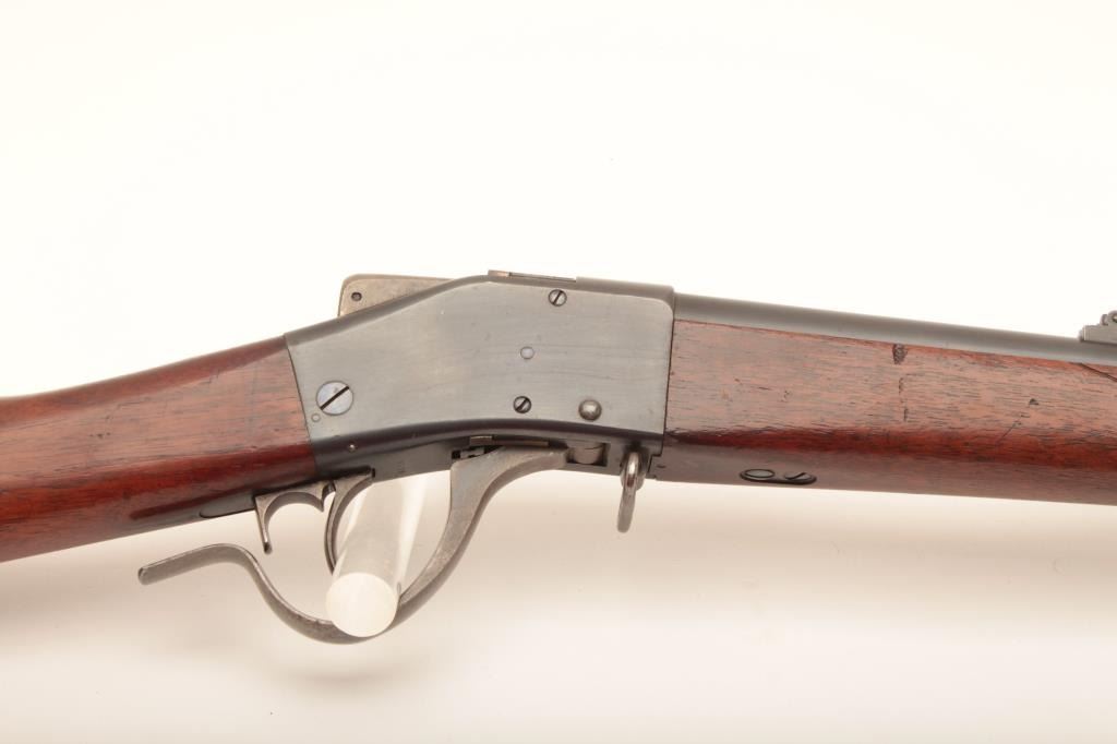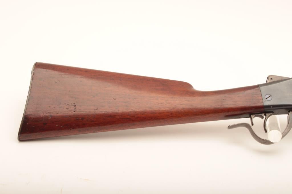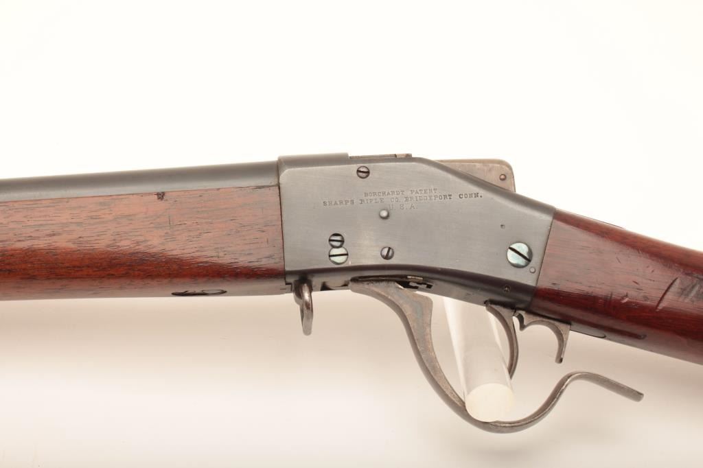 Sharps-Borchardt musket, .45-70 caliber, 32” barrel, blued finish, wood stocks with checkered steel butt plate, S/N 9570; overall very good to fine condition with a very good + bore, crisp action, majority of original finish remaining on metal surfaces, sharp markings and very good wood stocks with a small cartouche on the left side of the butt stock of the letters “LB” inside a circle. A very clean Model 1878 Sharps. (Antique). Est.: $1,250-$2,500.